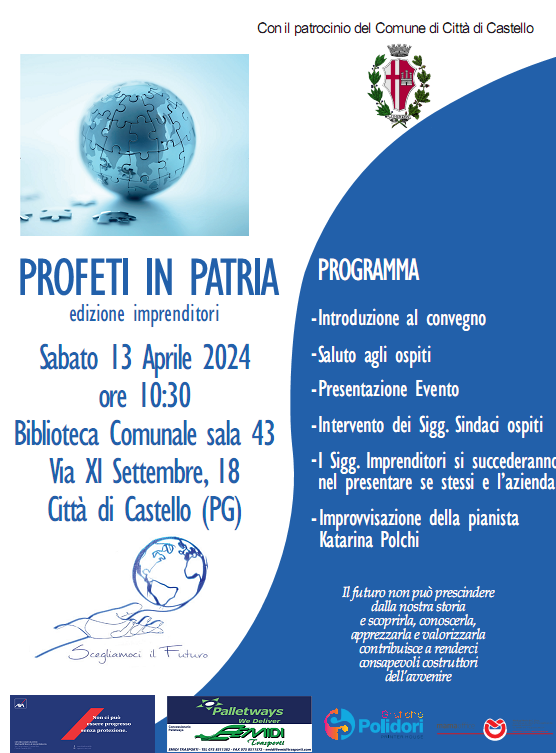 Città di Castello – E’ stata presentata presso la sede dell’Associazione “Scegliamoci il Futuro” la 2° edizione del format “Profeti in Patria” patrocinata dal Comune di Città di Castello. L’evento come hanno spiegato Franco Campagni e Marco Sensi, Presidente e Vice Presidente dell’Associazione, si svolgerà Sabato prossimo 13 Aprile alle ore 10,30 nella Sala 43 della Biblioteca Comunale in Città di Castello