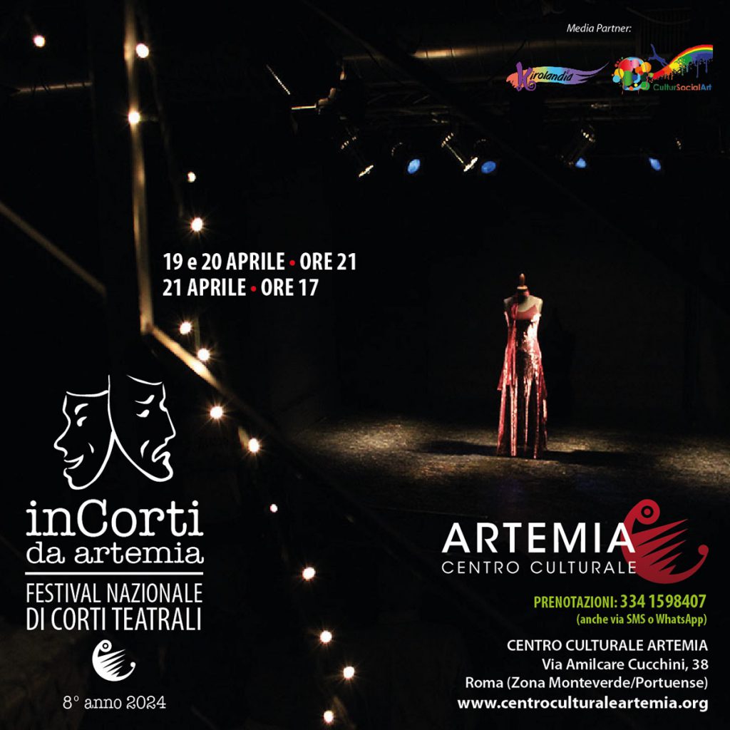 ROMA – All’8° edizione 2024 del suo Festival Nazionale di Corti Teatrali “inCorti da Artemia”. Rassegna-Concorso Nazionale per Corti Teatrali dedicato ad artisti e gruppi operanti nel territorio nazionale italiano. da Artemia – Festival Nazionale di Corti Teatrali Dal 19 al 21 aprile 2024 Serata di Gala: 26 aprile 2024 Per l’8° anno, il Centro Culturale Artemia di Roma è felice di tornare a presentare il suo Festival Nazionale di Corti Teatrali, dedicato ad artisti e gruppi operanti nel territorio nazionale italiano.