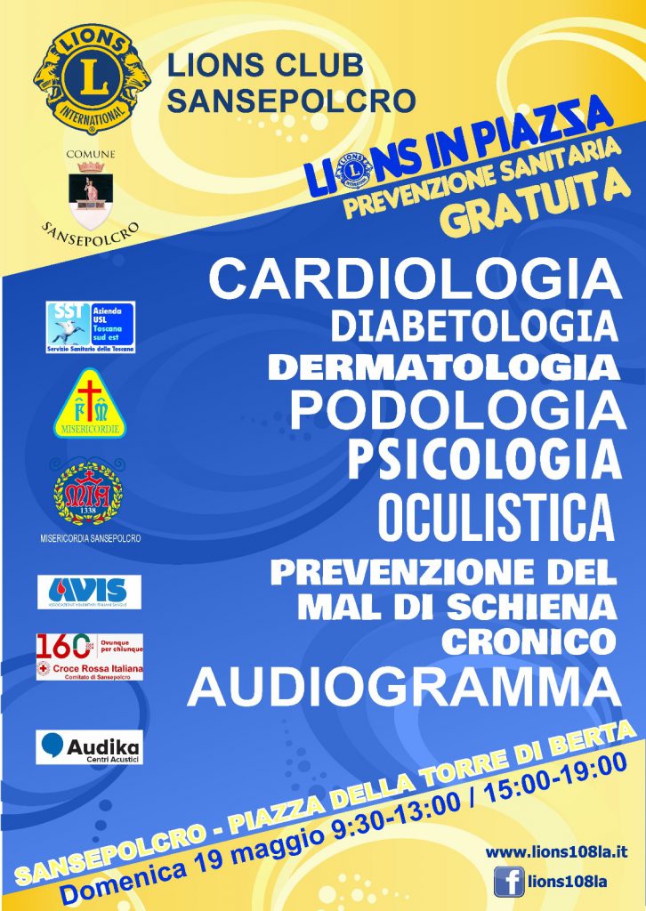 Torna l’iniziativa “Lions in Piazza”, una giornata dedicata alla prevenzione sanitaria gratuita, che si terrà domenica 19 maggio in Piazza Torre di Berta a Sansepolcro. L’evento, organizzato dal Lione Club di Sansepolcro, che gode del patrocinio del Comune, con l’obiettivo di promuovere la salute e il benessere della comunità locale, offrirà ai cittadini l’opportunità di accedere a controlli e screening gratuiti, grazie alla collaborazione di professionisti medici e specialisti del settore. Preziosa la collaborazione e la presenza in loco di Misericordia, Avis, Croce Rossa, Asl toscana Sud Est e Audika.Durante la giornata, saranno disponibili diversi servizi di screening gratuiti.L’iniziativa “Lions in Piazza” rappresenta un impegno tangibile del Lions Club di Sansepolcro nel promuovere la prevenzione sanitaria e nell’offrire supporto e assistenza alla comunità locale.