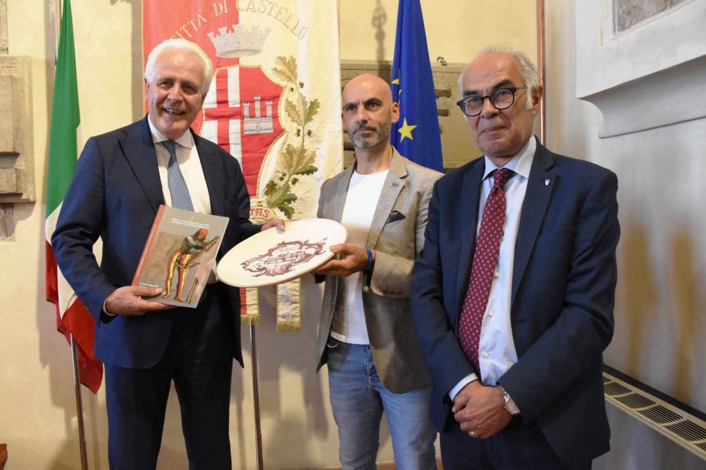 “I legami ottimi fra Umbria e Toscana su diversi ambiti e fronti comuni, pur nella distinzione geografica, vanno senza dubbio rafforzati in un’ottica di continua e proficua collaborazione che abbiamo potuto sperimentare come altotevere per esempio con la recente candidatura della valtiberina tosco-umbra a capitale della cultura ed altri progetti sinergici sempre in ambito culturale ed artistico come la “Valle del Signorelli”, itinerario che si snoda Cortona fino ad Umbertide e coinvolge luoghi di interesse internazionale dove sono custodite le opere del grande maestro del Rinascimento e dei suoi allievi. Umbria e Toscana dunque, regioni limitrofe e territori vicini dovranno proseguire su questo versante di collaborazione continua mettendo in atto, come per esempio abbiamo fatto con Sansepolcro ed altri comuni della vallata, progetti e protocolli di intesa trasversali e unitari per il bene delle nostre comunità”. E’ quanto dichiarato oggi dal sindaco di Citta’ di Castello Luca Secondi, a margine del convegno e sulla mostra “Matteotti: un esempio per l’oggi”, in corso di svolgimento presso la sala ed atrio del comune, nel corso di un breve ma cordiale incontro con il presidente della regione Toscana, Eugenio Gianni, assieme al Presidente del Consiglio Comunale, Luciano Bacchetta. “Basta pensare a quel percorso di storia e tradizione che lega Firenze, “culla” del Rinascimento e Citta’ di Castello, con e opere dei grandi maestri Raffaello e Signorelli, per proseguire su questo versante di intese e collaborazioni fra territori di regioni diverse ma vicine”, ha concluso Secondi nel rimarcare “le affinità e collegamenti con la vicina Toscana dove i Vitelli grande famiglia tifernate ebbero contatti con i Medici ed altri prestigiosi casati”. Il Presidente della regione Toscana, Eugenio Giani, nel sottolineare il grande valore storico del convegno e della mostra su “Matteotti”, ha parlato di “ulteriore occasione di scambi culturali e sociali con la vicina Umbra, fra la Valtiberina Toscana e l’altotevere umbro per rafforzare anche quel concetto concreto dell’Italia di mezzo che vede protagoniste più regioni nel remare dalla stessa parte. Oggi a Citta’ di Castello – ha concluso il Presidente Giani – abbiamo compiuto tutti insieme un altro passo”. Al termine dell’incontro il sindaco Secondi ed il Presidente del Consiglio Comunale, Luciano Bacchetta hanno consegnato al presidente della regione Toscana un volume sul cinquecentenario di Signorelli ed il piatto celebrativo dei 750 anni dell’istituzione della Baronia di Monte Ruperto, “exclave” del comune di Citta’ di Castello, realizzato dalla Bottega realizzato dalla Cooperativa Ceramiche Noi.