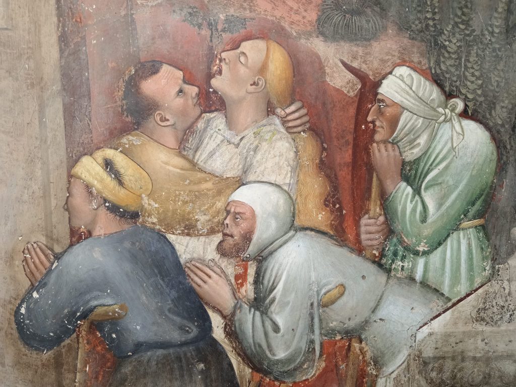 Tale serie di interventi si innesta su quelli già avviati dall’associazione Chiese Storiche, determinando così una bella sinergia tra le due associazioni, tesa alla salvaguardia delle numerose opere d’arte qui conservate. Tale intervento sta riportando alla luce un’opera di notevole qualità, divenuta col tempo poco leggibile per gli strati di polvere e altro sedimentatisi; già attribuita ad Antonio Alberti da Ferrara (Ferrara, 1390/1400 – Urbino, 1442/1449), del quale si conserva in pinacoteca un trittico a fondo oro proveniente dalla ex chiesa di San Bartolomeo. Il suo periodo formativo si svolse, con molta probabilità, nelle Marche e in Umbria a contatto con l’arte di Ottaviano Nelli e di Gentile da Fabriano, tutti e due questi ultimi hanno lavorato in città. Del Nelli si conserva un affresco con la ‘dormitio virginis’ a S. Maria delle Grazie, mentre Il Vasari, nelle ‘Vite’, parla esplicitamente di Gentile intento a dipingere a Città di Castello. Questo affresco appartiene in pieno a quel periodo della Storia dell’Arte chiamato ‘Gotico Internazionale’, che vede in questa chiesa alcuni importanti esempi. E chissà se da qualche parte, qui o altrove in città, emergerà anche la ‘mano’ di Gentile… Recenti studi datano questo affresco al 1424, data di consacrazione della nuova chiesa dei domenicani. Grazie ai restauri si sta procedendo allo svelamento di un’opera che riteniamo debba essere più attentamente studiata dagli storici dell’arte. L’iconografia si rifà alla ‘Leggenda di Patras’, manoscritto dell’anno mille, di notevole diffusione nei successivi secoli, ma anche ad altre fonti. Queste opere, come altre, necessitano di interventi conservativi e di valorizzazione di cui TifernArte si fa promotrice. Città di Castello ha molto ancora da rivelare e questo dipinto lo dimostra appieno. La fine dei lavori è prevista per ottobre p.v. quando verrà organizzato un convegno di presentazione delle opere e dei restauri, di cui daremo notizia. TifernArte ha in serbo altri interventi per il prossimo futuro, sempre all’insegna della valorizzazione del nostro patrimonio storico artistico.