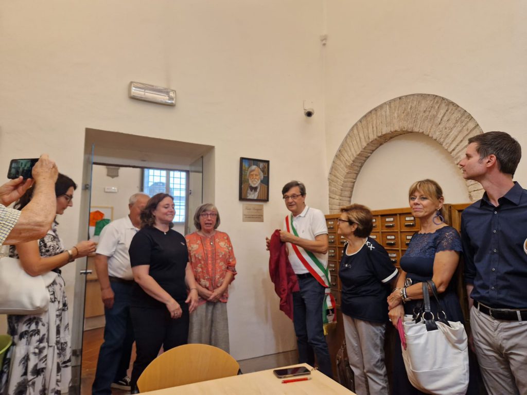 L’assessore Mercati ha spiegato come sia stato unanime il pensiero di rendere omaggio a colui che amava così profondamente questa città, la sua storia e i suoi abitanti. Nata da un’idea dell’associazione Vivere a Borgo Sansepolcro Pro Loco la proposta di intitolazione è stata particolarmente apprezzata dall’Amministrazione comunale. L’evento ha visto la partecipazione di numerosi cittadini, rappresentanti delle associazioni locali e amici di Fausto, in un clima di grande emozione. Pascale e Tanya hanno espresso gratitudine per il riconoscimento dedicato al marito e padre, sottolineando l’importanza che lui attribuiva alla preservazione e alla diffusione della memoria storica del Borgo. Pascale ha condiviso piccoli aneddoti sulla passione di Fausto per la storia locale, testimoniata anche dalla sua opera “M’Arcordo,” una raccolta di racconti orali e tradizioni del Borgo, che ha contribuito, e contribuirà, a mantenere vive le radici culturali della comunità. Il sindaco di Sansepolcro, Fabrizio Innocenti, ha sottolineato l’importanza di onorare personalità come Fausto Braganti, che con il loro impegno culturale hanno arricchito il patrimonio storico e culturale della città. Il primo cittadino ha evidenziato come la dedicazione della sala rappresenti un tributo duraturo al contributo di Fausto nella conservazione della memoria storica locale, ispirando le future generazioni a continuare questo importante lavoro. Nella sala di lettura, ora a lui intitolata, è stato anche inaugurato un bellissimo ritratto di Fausto realizzato magistralmente dall’artista Maurizio Rapiti, un omaggio indelebile che lo farà vivere per sempre in questo luogo. Così diverrà un punto di riferimento anche per studiosi e appassionati di storia, qui dove il passato continua a vivere e a raccontare la sua storia attraverso i documenti conservati. Questa cerimonia è stata un momento di grande importanza per la città, celebrando la memoria di un cittadino che ha contribuito in modo significativo alla vita culturale di Sansepolcro e lasciando un’eredità preziosa per tutti.