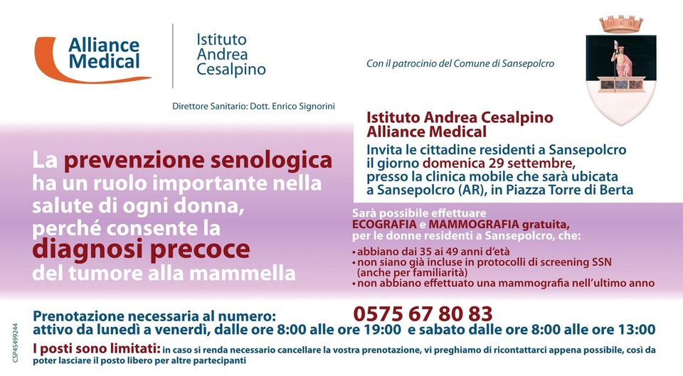 Il Comune di Sansepolcro, in collaborazione con l’Istituto Andrea Cesalpino, invita tutte le donne residenti a Sansepolcro a partecipare a una giornata dedicata alla prevenzione senologica