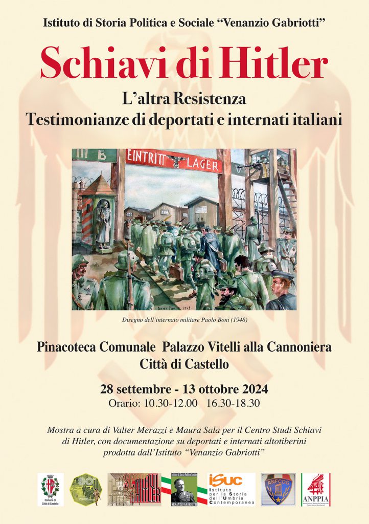 Sabato 28 settembre alle ore 11.00 nella Manica Lunga della Pinacoteca Comunale di Città di Castello, verrà inaugurata la mostra documentaria dal titolo “Schiavi di Hitler. L’altra Resistenza. Racconti, disegni, documenti dei deportati italiani 1943-1945”, nell’ambito delle iniziative per l’80° della Liberazione di Città di Castello e dell’Alta Valle del Tevere. La mostra, è realizzata da Valter Merazzi e Maura Sala per il Centro Studi Schiavi di Hitler, mentre la documentazione su deportati e internati altotiberini è prodotta dall’Istituto “Venanzio Gabriotti”, resterà aperta fino a domenica 13 ottobre 2024 dalle ore 10.30 alle ore 12.00 e dalle 16.30 alle ore 18.30.