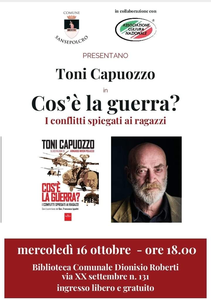 SANSEPOLCRO – Nella Biblioteca comunale di Sansepolcro presentazione del libro di Toni Capuozzo. Il Comune di Sansepolcro, in collaborazione con l’Associazione Cultura Nazionale, è lieto di invitare la cittadinanza a un importante evento culturale e formativo che vedrà protagonista il noto giornalista e reporter di guerra Toni Capuozzo. Mercoledì 16 ottobre 2024, presso la Biblioteca Comunale Dionisio Roberti di Sansepolcro, alle ore 18:00, Capuozzo presenterà il suo ultimo libro intitolato “Cos’è la guerra? I conflitti spiegati ai ragazzi”.