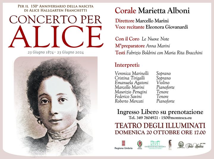 In occasione del 150° anniversario della nascita di Alice Hallgarten Franchetti, domenica 20 ottobre alle ore 17,00 presso il Teatro degli Illuminati di Città di Castello, sarà presentato un concerto della Corale Marietta Alboni dedicato ad Alice, con la partecipazione dell’attrice Eleonora Giovanardi. Alice Hallgarten è stata una figura di spicco nello sviluppo della pedagogia contemporanea e nel movimento di emancipazione femminile dei primi del Novecento.