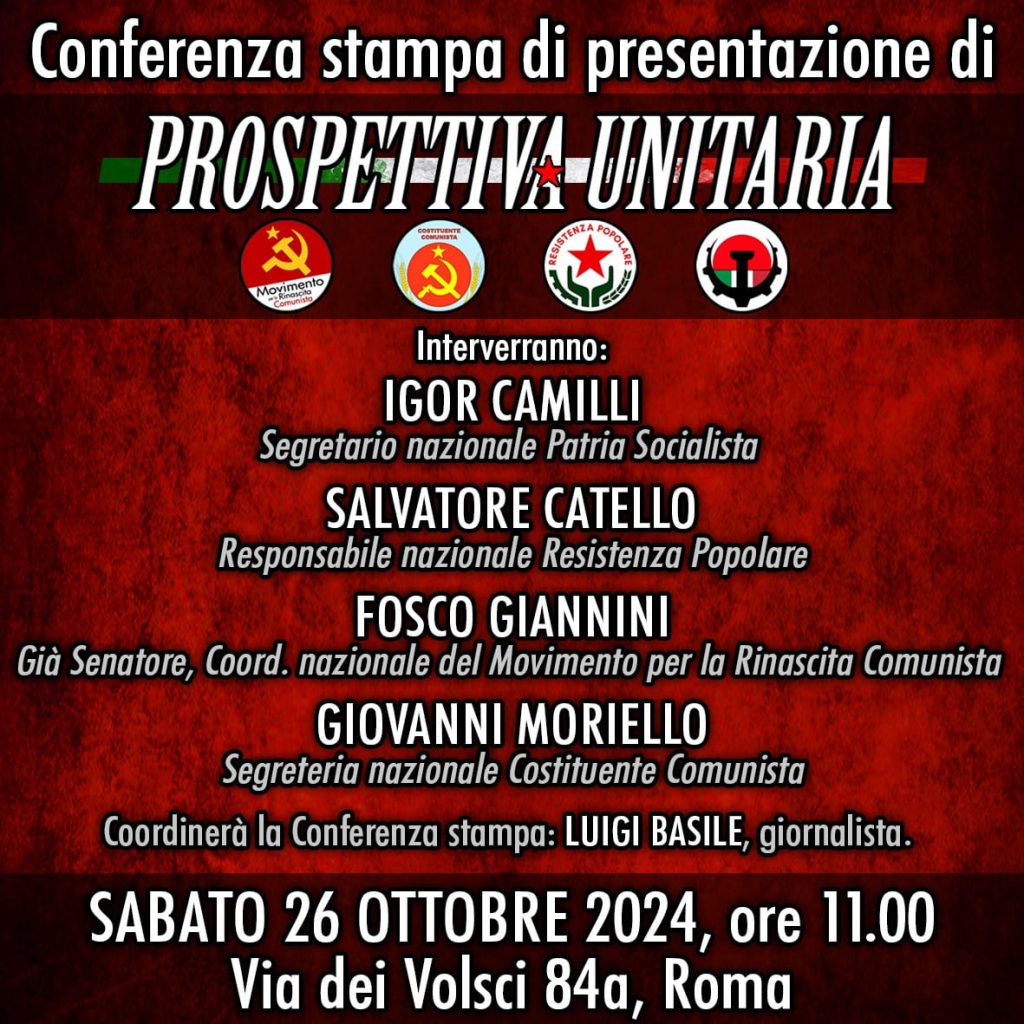 .Le organizzazioni politiche Costituente Comunista, Movimento per la Rinascita Comunista, Patria Socialista e Resistenza Popolare, che avevano già avviato un percorso politico comune, costituendo il Tavolo per l’unità di azione e di lotta dei comunisti, indicono una conferenza stampa per la presentazione di un nuovo progetto politico, denominato Prospettiva Unitaria, che si terrà sabato 26 Ottobre, alle 11, a Roma, nella sede di Via dei Volsci n. 84/a