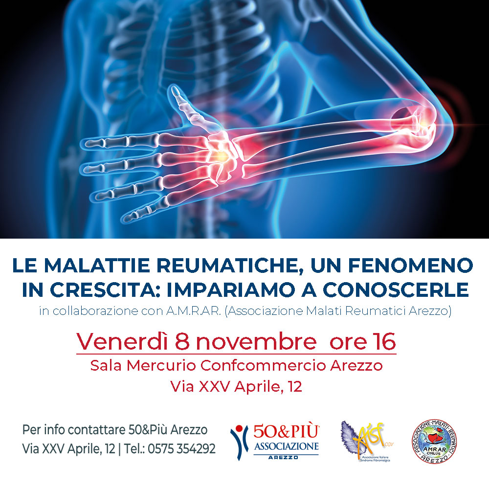 Venerdì 8 novembre, alle ore 16 nella Sala Mercurio di Confcommercio in via XXV Aprile 12, la 50&Più Arezzo organizza un evento informativo in collaborazione con A.M.R.A.R.(Associazione Malati Reumatici Arezzo). L’ingresso è libero e gratuito.50&Più Arezzo, in collaborazione con l’A.M.R.AR. (Associazione Malati Reumatici Arezzo), organizza un convegno dal titolo “Le malattie reumatiche, un fenomeno in crescita: impariamo a conoscerle”.