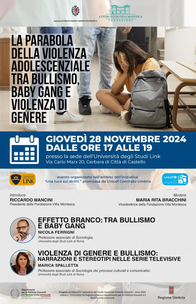 Risulta evidente la necessità di un approccio integrato a tali devianze, di un sistema educativo che coinvolga e valorizzi le dimensioni emotiva e relazionale, di una strategia di intervento basata su un’attenta analisi e comprensione delle problematiche alla base dei fenomeni. Di queste tematiche se ne parlerà giovedì 28 novembre 2024, dalle ore 17 alle 19, presso la sede dell’Università degli Studi Link, Via Carlo Marx 20, Cerbara di Città di Castello, al seminario dal titolo “La parabola della violenza adolescenziale tra bullismo, baby gang e violenza di genere”, promosso dalla Fondazione Villa Montesca e dal Comune di Città di Castello nell’ambito del progetto “Il futuro è qui” – di cui al Fondo Nazionale Politiche Giovanili 2022 – Intesa n.77/2022”. L’evento sarà introdotto da Riccardo Mancini, Presidente della Fondazione Villa Montesca, e moderato da Maria Rita Bracchini, Vicedirettrice di Villa Montesca. Tra i relatori, Nicola Ferrigni, Professore Associato di Sociologia presso la Link Campus University di Roma, parlerà dell’effetto branco tra bullismo e baby gang, mentre Marica Spalletta, Professoressa Associata di Sociologia dei processi culturali e comunicativi presso la stessa università, affronterà il tema della violenza di genere e del bullismo, con un focus sulle narrazioni e gli stereotipi nelle serie televisive. L’evento è aperto a genitori, insegnanti e educatori, e chiunque interessato ad approfondire le questioni legate alla violenza adolescenziale e alla promozione dei diritti dell’infanzia e dell’adolescenza (secondo recenti dati Unicef, il 65% dei giovani ha dichiarato di essere stato vittima di violenza, con il 63% che ha subito atti di bullismo e il 19% di cyberbullismo. Inoltre, circa 120 milioni di ragazze sotto i 20 anni nel mondo hanno subito qualche forma di abuso sessuale). L’evento si inserisce nel quadro della manifestazione “Una luce sui diritti”, promossa da Unicef – Comitato Umbria nell’Alta Valle del Tevere umbra in occasione del 50° anniversario della nascita di Unicef Italia.