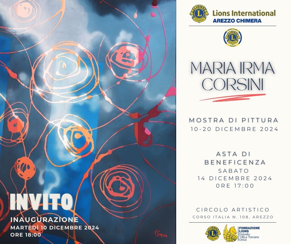 “Una mostra per Maria Irma Corsini” Evento espositivo delle opere pittoriche dell’artista e asta di beneficenza. Il Lions Club Arezzo Chimera continua ad impegnarsi con entusiasmo in importanti attività di servizio e in iniziative culturali volte a valorizzare le eccellenze del nostro territorio