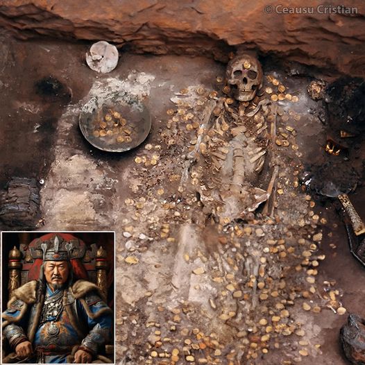 I ricercatori dell’Università di Pechino hanno studiato il sito enigmatico, traendo conclusioni sorprendenti. Gli scheletri trovati sopra la struttura di pietra erano probabilmente individui che avevano contribuito alla costruzione della tomba, onorati con l’eterno riposo per proteggere i segreti del luogo. Tra i reperti, vi erano dodici resti di cavalli maestosi, destinati ad accompagnare il leader nel regno dell’aldilà. Uno spettacolo inquietante si è rivelato con la scoperta di 68 scheletri, consumati dal tempo, sepolti sotto il letto del fiume fino a quando, nel XVIII secolo, il corso dell’Onon non cambiò.Tra i resti preziosi c’era uno scheletro maschile di alta statura e sedici scheletri femminili, circondati da manufatti scintillanti d’oro e d’argento. Le donne erano probabilmente mogli e concubine del sovrano, destinate a seguirlo nell’eternità. La ricchezza dei tesori, insieme al numero di persone sepolte, dipinge un quadro vivido di un potente capo mongolo. L’analisi approfondita dei resti maschili ha rivelato un individuo di età compresa tra i 60 e i 75 anni, morto tra il 1215 e il 1235 d.C., suggerendo che questa elaborata tomba potrebbe essere il luogo di riposo finale del grande Gengis Khan.Questa scoperta getta nuova luce sulla storia e l’archeologia. Gengis Khan, nato Temüjin, fu il visionario che fondò il vasto Impero Mongolo, dominando territori che abbracciavano continenti e lasciando un’eredità incancellabile. Le sue spedizioni militari e la sua influenza culturale attraverso la Via della Seta collegarono l’Oriente e l’Occidente, rendendolo una figura senza pari nella storia mondiale.