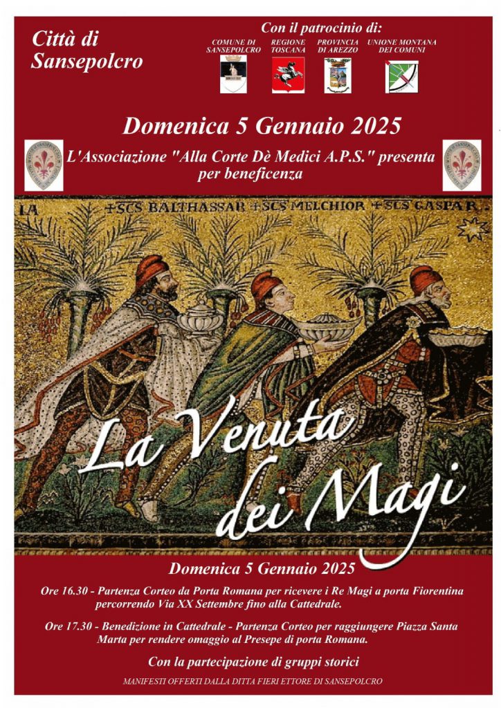 SANSEPOLCRO – Il 5 gennaio 2025, Sansepolcro darà vita ad un evento di grande significato culturale e benefico: la Venuta dei Magi, una manifestazione che unisce tradizione, spettacolo e solidarietà organizzata dall’Associazione “Alla corte de’ Medici”