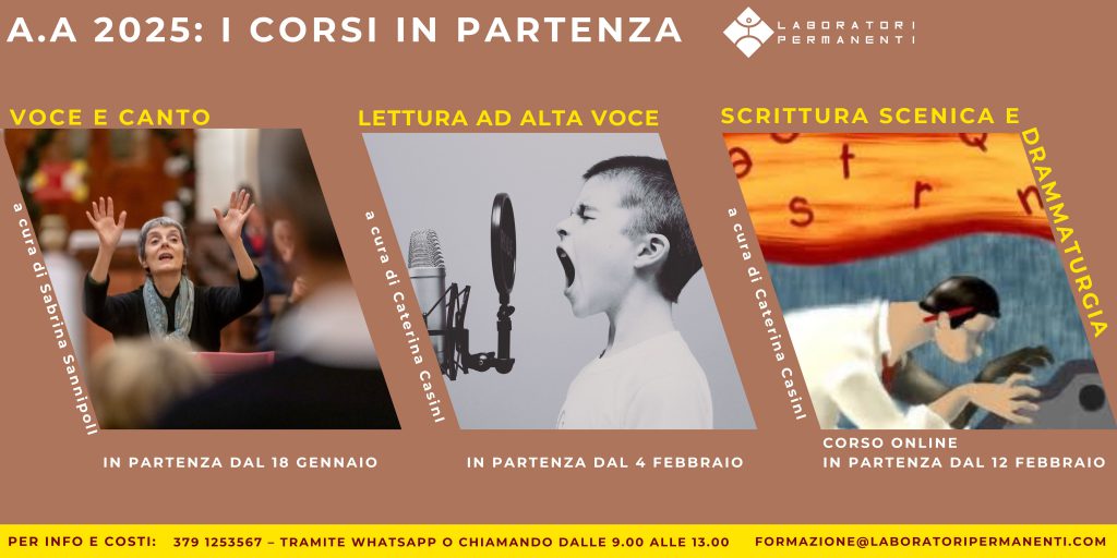 L’incontro/scontro tra due generazioni, gli accadimenti della vita, i progetti: il caso avvicina due personaggi di diversa generazione, in un luogo di transito urbano. Un dialogo a volte duro a volte ironico, che riesce a diventare poesia quando l’attenzione, finalmente, si rivolge all’altro e non a sé stessi. Nato dal corso di Scrittura Scenica e Drammaturgia, il copione si è sviluppato in una messa in scena diretta, incisiva, essenziale. Laboratori Permanenti prosegue l’attività di formazione intrapresa e inizia il nuovo anno dando il via a tre corsi per professionisti e principianti, che vanno a integrarsi con le attività didattiche avviate a ottobre 2024. In partenza dal 18 gennaio il corso di voce e canto VOCINSIEME a cura di Sabrina Sannipoli,prevede 2 incontri mensili.