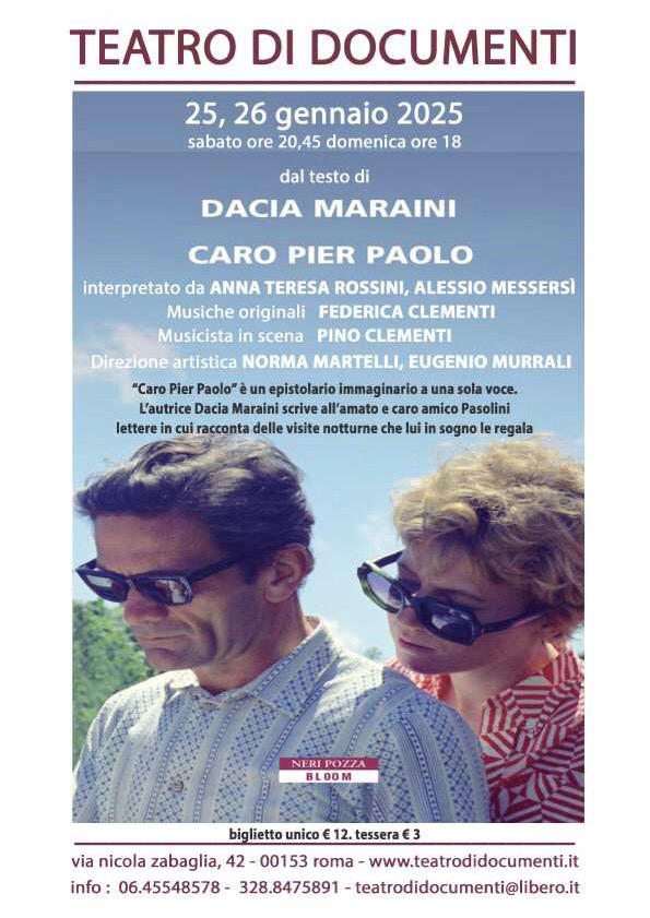 Un epistolario immaginario a una sola voce in cui l’autrice Dacia Maraini scrive all’amato e caro amico Pier Paolo Pasolini lettere in cui racconta delle visite notturne che lui in sogno le regala, svelando i loro dialoghi intimi che si dipanano tra riflessioni profonde, polemiche artistiche e confessioni personali. Al Teatro di Documenti il 25 e 26 gennaio “Caro Pier Paolo” di Dacia Maraini. Tratto dal libro omonimo, pubblicato nel 2022, lo spettacolo mette in scena alcune delle lettere, selezionate da Norma Martelli ed Eugenio Murrali, che parlano dei momenti più personali della amicizia tra la Maraini e Pasolini. Ad Anna Teresa Rossini il compito di svelarle al pubblico, aiutata dalla presenza in scena di Alessio Messersì. Le note del sax di Pino Clementi, elaborate su musiche di Federica Clementi, rispondono alle lettere con suono a volte stridente, così come stridente fu la vita di Pier Paolo Pasolini.
