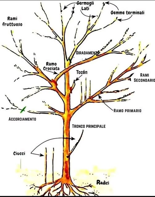 Diagrama illustrativo delle principali parti di un albero da frutto e delle tecniche di potatura consigliate per favorire la crescita e una produzione efficienteUna potatura corretta include il diradamento, l’accorciamento, l’eliminazione dei polloni e dei rami incrociati per garantire una struttura forte e produttiva.