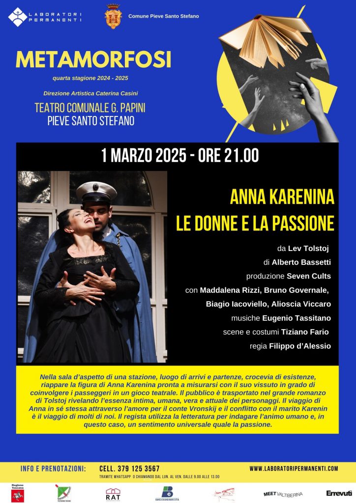 L’evento è a ingresso gratuito. Si prosegue sabato 1° marzo 2025 alle ore 21.00 con lo spettacolo Anna Karenina, le donne e la passione da Lev Tolstoj, di Alberto Bassetti, una produzione Seven Cults con Maddalena Rizzi, Bruno Governale, Biagio Iacoviello, Alioscia Viccaro, musiche di Eugenio Tassitano, scene e costumi di Tiziano Fario e la regia di Filippo d’Alessio. Nella sala d’aspetto di una stazione, luogo di arrivi e partenze, crocevia di esistenze, riappare la figura di Anna Karenina pronta a misurarsi con il suo vissuto in grado di coinvolgere i passeggeri in un gioco teatrale. Il pubblico è trasportato nel grande romanzo di Tolstoj rivelando l’essenza intima, umana, vera e attuale dei personaggi. Il viaggio di Anna in sé stessa attraverso l’amore per il conte Vronskij e il conflitto con il marito Karenin è il viaggio di molti di noi. Il regista utilizza la letteratura per indagare l’animo umano e, in questo caso, un sentimento universale quale la passione. Infine, chiude la rassegna nei giorni 15 e 16 marzo 2025 IL CORPO LA VOCE IL RACCONTO – 2° step -laboratorio teatrale condotto da Caterina Casini, secondo appuntamento formativo sul teatro, dedicato ai cittadini di Pieve Santo Stefano e territori limitrofi, per un approfondimento su cosa sia l’espressione teatrale, per creare un pubblico attivo e attento alle proposte culturali che vengono presentate durante l’anno. Attraverso la pratica dell’arte, sperimentando la propria creatività, i partecipanti imparano a mettersi in gioco e fanno esperienza diretta di cosa sia il lavoro di una messa in scena. Un avvicinamento al Teatro coinvolgente e divertente, in cui si lavorerà su canovaccio per provare a montare la scena comica finale del “Gianni Schicchi” di Puccini. Alla fine del percorso un incontro dimostrativo col pubblico. Questo appuntamento rientra nel progetto vincitore del bando Festa della Toscana 2024 dal titolo “Conoscenza e consapevolezza della tradizione – ponte verso l’innovazione” promosso da Laboratori Permanenti e Coro Valtiberino.