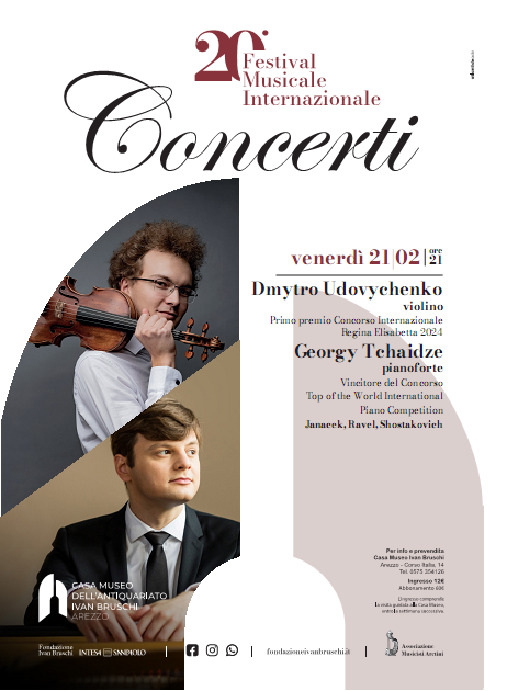 Venerdì 21 febbraio alle 21, si terrà il primo concerto – in esclusiva assoluta per l’Italia – che vedrà protagonisti, dopo il saluto del Presidente della Fondazione Bruschi Luca Benvenuti, due musicisti pluripremiati nei più importanti concorsi internazionali al mondo: il violinista ucraino Dmytro Udovychenko, vincitore del concorso Regina Elisabetta 2024, e il pianista russo Georgy Tchaidze (in sostituzione di Lukas Geniusas), già vincitore del Honens International Piano Competition e del Top of the World Piano Competition. Eseguiranno musiche di Janaceck, Ravel, Shostakovich e Stankovych.