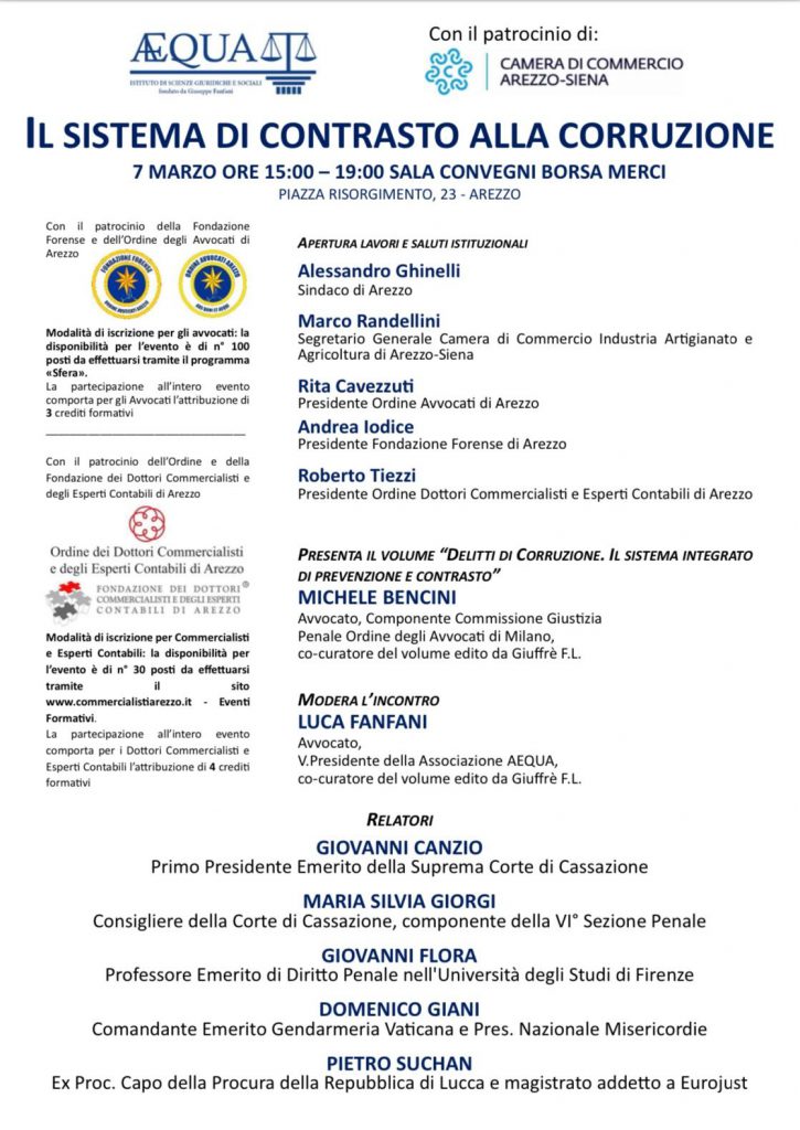 AREZZO – Venerdì 7 marzo si svolgerà, nella Sala Convegni della Borsa Merci di Arezzo il convegno dal titolo “Il sistema di contrasto alla corruzione”. L’evento è promosso dall’Associazione AEQUA con il patrocinio tra gli altri dell’Ordine e della Fondazione dei Dottori Commercialisti ed Esperti Contabili della provincia di Arezzo.