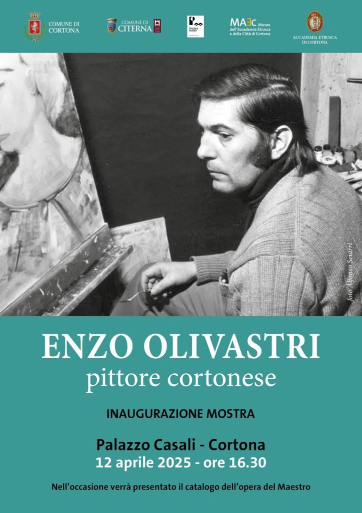 Interverranno Luciano Meoni, sindaco di Cortona, Valentina Ercolani, assessore alla cultura del Comune di Citerna, Paolo Bruschetti, vice lucumone dell’Accademia Etrusca di Cortona, Marco Botti, giornalista e curatore d’arte in rappresentanza del Piccolomuseo di Fighille, e Gioia Olivastri, figlia del pittore. Per l’occasione verrà presentato il catalogo “Enzo Olivastri pittore cortonese” dedicato al maestro, pubblicato dal Piccolomuseo di Fighille, museo e centro diffuso per l’arte contemporanea. L’esposizione, patrocinata da Comune di Cortona, Accademia Etrusca di Cortona, Maec, Comune di Citerna e Piccolomuseo di Fighille, sarà visitabile tutti i giorni, con orario 10-19.