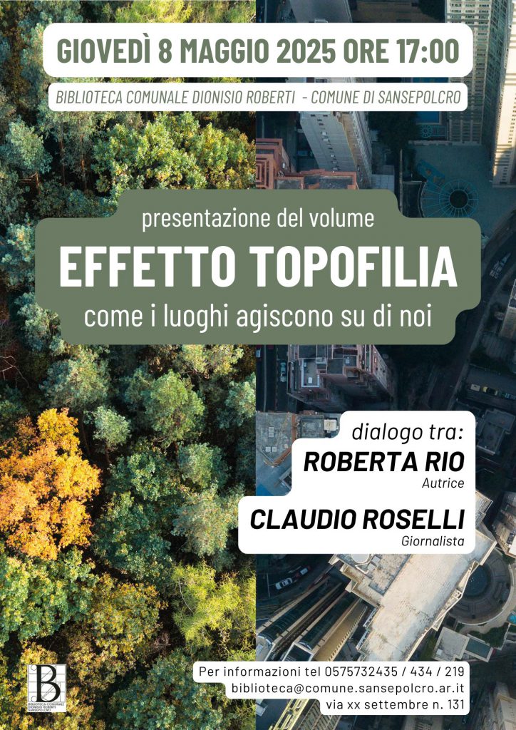 Sansepolcro la presentazione del libro di Roberta Rio, giovedì 8 maggio alla Biblioteca Comunale Dionisio Roberti. Giovedì 8 maggio 2025, alle ore 17:00, presso la Biblioteca Comunale “Dionisio Roberti” di Sansepolcro, si terrà la presentazione del libro “Effetto Topofilia®. Come i luoghi agiscono su di noi”, saggio scritto dalla storica e ricercatrice Roberta Rio, austriaca di origini italiane, riconosciuta a livello internazionale per le sue consulenze in merito alle interazioni tra esseri umani e luoghi (Genius Loci).