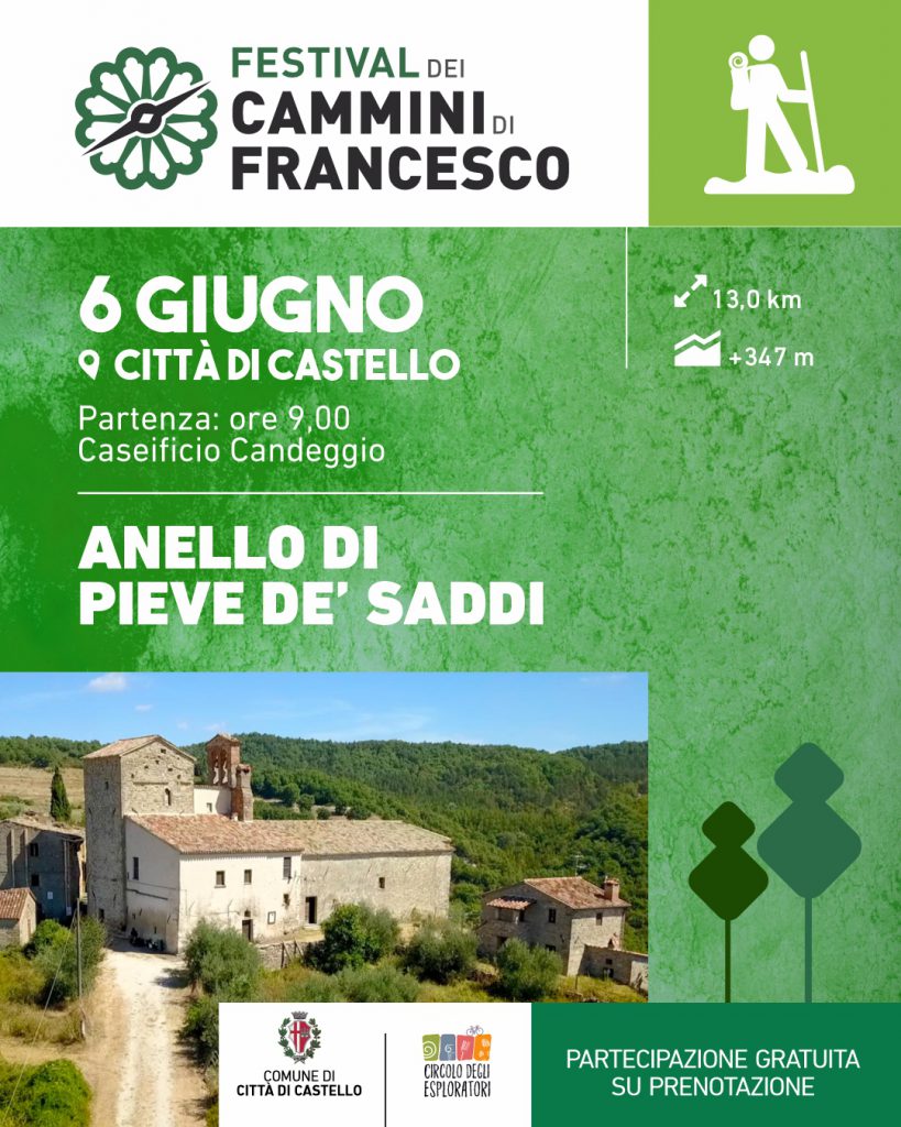 Venerdì 6 giugno Ore 9.00 – Camminata “Anello di Pieve de’ Saddi”. Partenza: Caseificio Candeggio