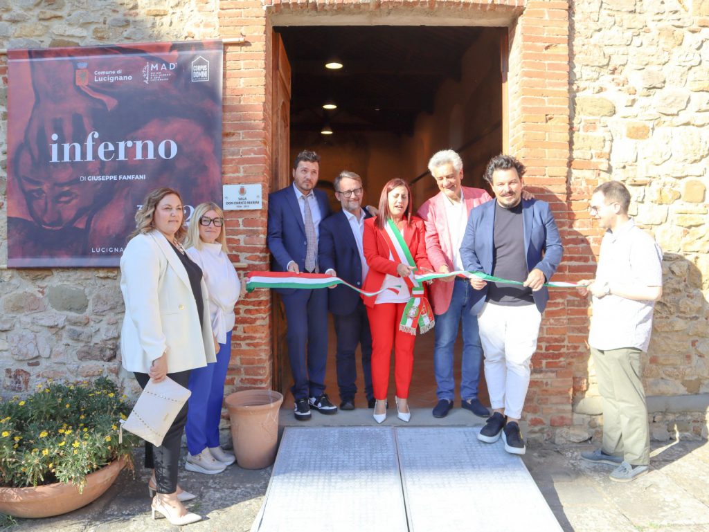 L’evento ha visto la presenza di molte personalità di spicco e amici dell’autore, noto al grande pubblico per il suo lungo e prestigioso percorso nelle istituzioni, ma che oggi si presenta in una veste forse meno nota ma profondamente autentica: quella di pittore. Giuseppe Fanfani – avvocato, già sindaco di Arezzo, deputato, componente laico del Consiglio superiore della magistratura e oggi Garante per i diritti dei detenuti della Regione Toscana – ha infatti dichiarato che la pittura è la sua “prima, autentica passione”. Una passione che lo accompagna fin dagli anni della gioventù e che, come ha spiegato egli stesso, affonda le radici negli anni Sessanta, quando iniziò a dipingere a Perugia. La mostra Inferno, ispirata alla ‘Divina Commedia’ dantesca, è nata nel 2016 e da allora ha attraversato l’Italia con tappe in sedi prestigiose: Arezzo, Firenze, Città della Pieve, Sansepolcro, Napoli e, prossimamente, anche Roma e San Marino. A Lucignano è proposta in una versione esaustiva e curata, con 18 delle 47 tele complessive selezionate per l’occasione. Le opere trasportano il visitatore nelle atmosfere infernali dell’Ade dantesca, proprio come fece il poeta Virgilio con Dante. Il rosso, il nero e il giallo sono i colori che predominano nelle scene dipinte da Fanfani, nel continuo susseguirsi di tenebre e fuoco, di dolore e terrore, di disperazione e rassegnazione, di movimento e di quiete. E’ Fabio Migliorati, curatore del catalogo ‘Dante 699 – L’Inferno illustrato’, a raccontare l’evoluzione dell’opera pittorica di Fanfani, sottolineando l’uso costante di soli tre colori e uno stile “sintetico, forte ed energico”. “Oggi – ha spiegato – Fanfani sta vivendo un’esperienza di pittura informale, che conferma la sua autenticità artistica”. L’allestimento della mostra è stato pensato per esaltare il legame tra le opere e l’ambiente: “Abbiamo predisposto un’installazione particolare, con le tavole sospese a poca distanza dalle pareti”, ha dichiarato l’assessore al turismo e cultura di Lucignano, Stefano Cresti, che ha lavorato alla selezione delle opere insieme all’autore. Commosso e grato, Fanfani ha voluto ringraziare l’amministrazione comunale per l’opportunità, dedicando un pensiero speciale al borgo di Lucignano: “Chi definisce questi luoghi ‘centri minori’ non ha capito niente. Magari tante grandi città avessero la storia, l’arte, la qualità umana e la capacità di conservazione dell’identità che si respira qui”. Parole condivise anche dalla sindaca Roberta Casini, che ha definito la mostra “straordinaria” e perfettamente in sintonia con la bellezza della sala espositiva. “Ospitiamo le opere di una personalità del calibro di Giuseppe Fanfani, che ringrazio per avere accolto con entusiasmo il nostro invito. Lucignano – ha detto – vive grazie alla vivacità della sua comunità, alle tradizioni come la Maggiolata, all’arte e alla cultura. E noi vogliamo che questo borgo continui ad essere animato da eventi di alto profilo come questo”. Giuseppe Fanfani ha inoltre annunciato la prossima pubblicazione di un catalogo completo delle sue opere, a partire dal 1968 e ha anticipato che dal 26 novembre l’Inferno sarà ospitato a Roma presso la Società Dante Alighieri, per poi proseguire il suo viaggio a San Marino nel 2026.
