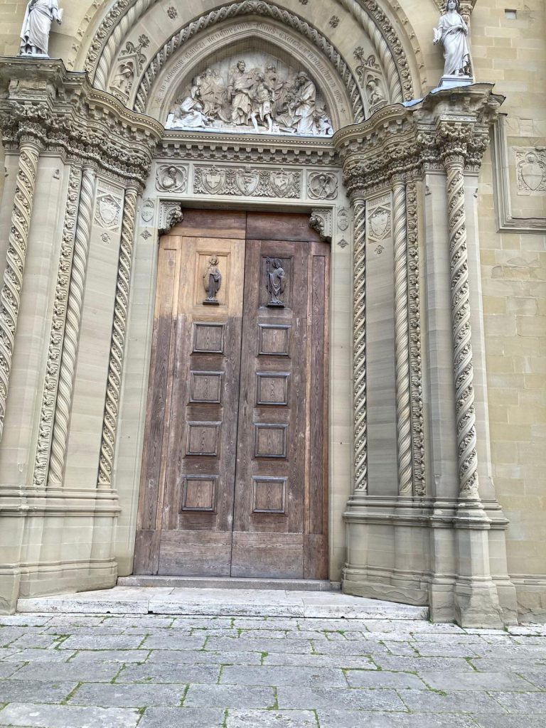 I portoni, realizzati in legno di castagno con fodera interna in legno di conifera, hanno un andamento verticale slanciato, presentano all’esterno una suddivisione geometrica accentuata dall’alternanza di formelle quadrate delimitate da cornici con modanatura piena e non molto aggettante come di consueto in manufatti simili realizzati ad inizio Novecento. Il portone centrale, invece, oltre ad essere leggermente più alto dei due laterali, nella parte superiore, presenta, al posto delle due formelle quadrate, due pannelli decorati a rilievo con le figure di San Donato, patrono della città di Arezzo e il beato Gregorio X.
