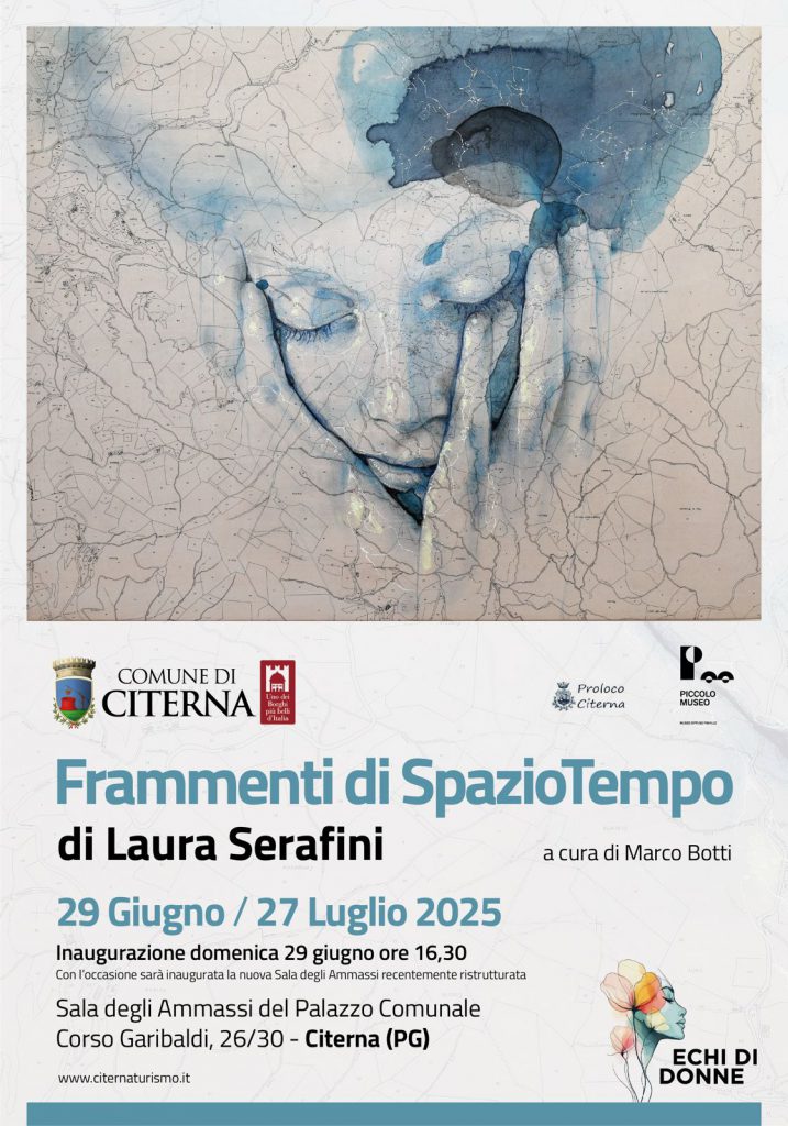 CITERNA – Si chiude domenica 27 luglio 2025 “Frammenti di SpazioTempo”, personale di pittura di Laura Serafini a cura di Marco Botti allestita nella Sala degli Ammassi, in Corso Garibaldi 26/30 a Citerna (PG). Tanti turisti hanno visitato la mostra che inaugura “Echi di donne”, rassegna estiva del Comune di Citerna per celebrare il talento, la forza, la creatività e l’empowerment femminile in diverse espressioni artistiche e culturali. La personale, visitabile gratuitamente tutti i giorni dalle ore 9 alle 12 e dalle ore 15 alle 18, è patrocinata da Comune di Citerna, Pro Loco di Citerna e Piccolomuseo di Fighille