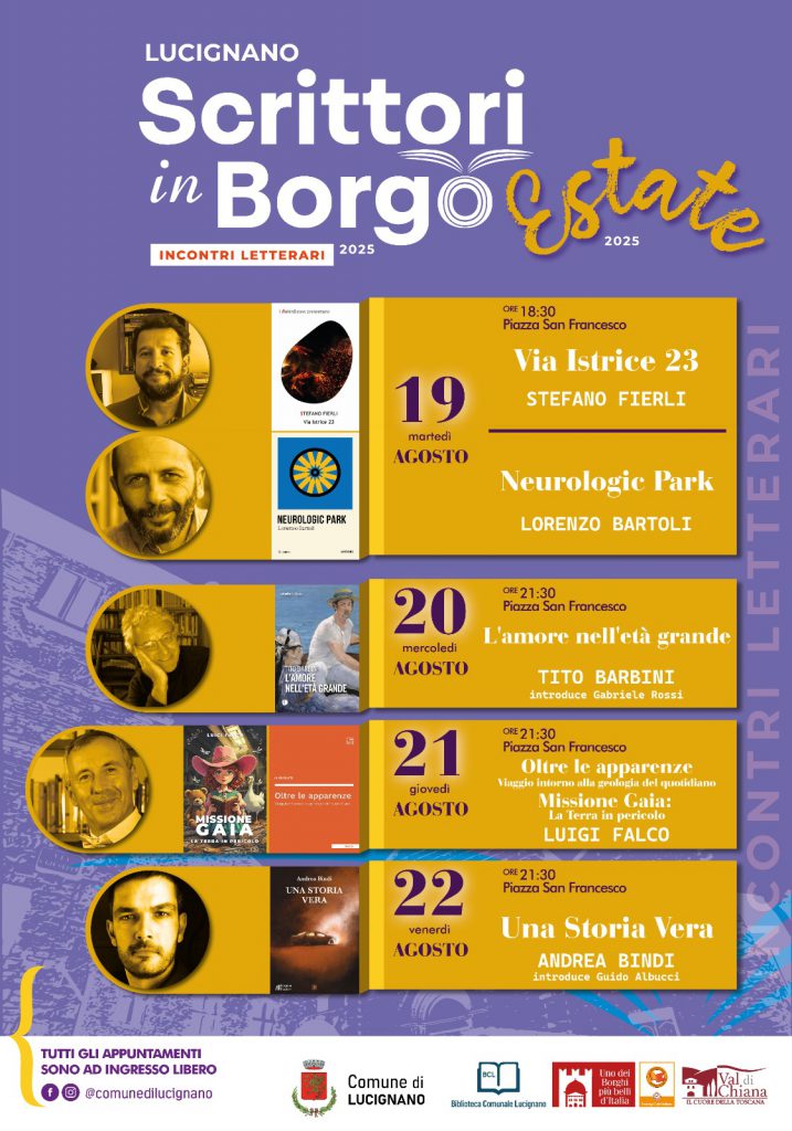 “Con Scrittori in Borgo ‘summer edition’ – spiega l’Assessore alla Cultura e Turismo Stefano Cresti – vogliamo offrire ai cittadini e ai visitatori un’occasione preziosa per incontrare gli autori e scoprire storie capaci di emozionare, far riflettere e stimolare un confronto autentico. Lucignano è un luogo che si presta naturalmente all’incontro culturale: i suoi spazi raccolti e suggestivi trasformano ogni presentazione in un’esperienza intima e coinvolgente”.