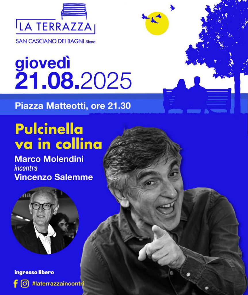 Continua con successo la rassegna estiva La Terrazza – Incontri a San Casciano dei Bagni, tra racconti e chiacchierate sulla vita che è stata e quella che verrà, il tutto condito da un sano pizzico di ironia. Infatti giovedì 21 agosto, alle ore 21:30 in Piazza Matteotti, l’appuntamento sarà con “Pulcinella va in collina”, che vedrà protagonista Vincenzo Salemme, in un dialogo vivace e leggero con il giornalista Marco Molendini.