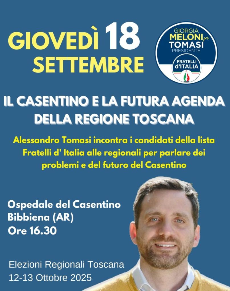 Al centro ci sarà un tema cruciale come la sanità, che oggi rappresenta una delle emergenze più gravi della Regione. Liste d’attesa infinite, ospedali sotto pressione e servizi insufficienti sono il frutto di una gestione fallimentare che ha penalizzato i cittadini. Con Alessandro Tomasi vogliamo restituire alla sanità toscana efficienza, vicinanza ai territori e attenzione alle persone, costruendo un modello moderno e sostenibile. Ma parleremo anche di sviluppo, lavoro e infrastrutture, perché la Toscana deve tornare protagonista e lo farà grazie alla concretezza e alla serietà di Fratelli d’Italia”. L’incontro di Bibbiena sarà un momento di ascolto e di confronto, tappa di un percorso che porterà Fratelli d’Italia e Alessandro Tomasi a presentare la propria visione per il futuro della Regione, con l’obiettivo di restituire fiducia e speranza ai toscani.