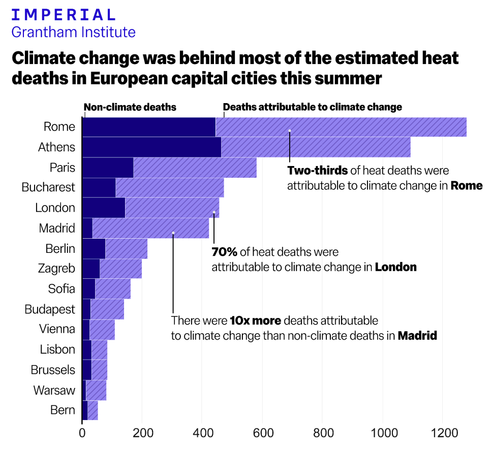 - Nelle capitali, i cambiamenti climatici hanno causato 835 morti per il caldo a Roma, 630 ad Atene, 409 a Parigi, 387 a Madrid, 360 a Bucarest, 315 a Londra e 140 a Berlino.