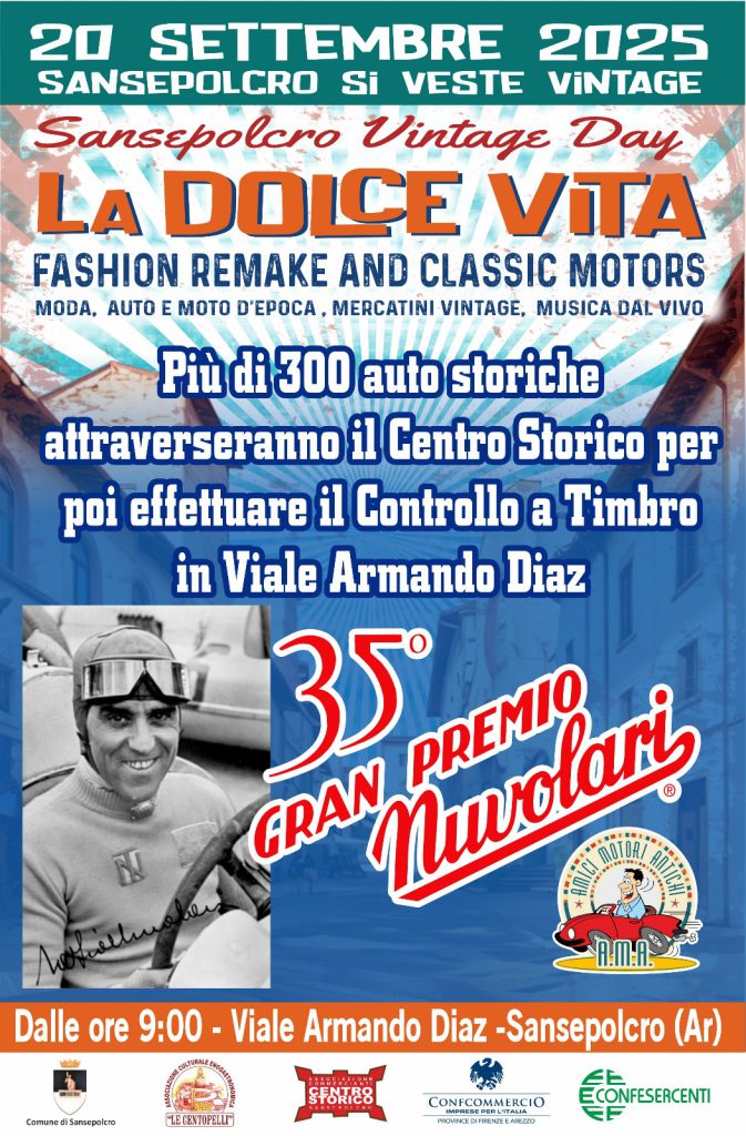 “La Dolce Vita – Vintage Day”, organizzato dall’Associazione Le Centopelli e Amici Motori Antichi, in collaborazione con il Comune di Sansepolcro, l’Associazione Commercianti del Centro Storico, Confesercenti e Confcommercio, è un’occasione speciale per immergersi nell’atmosfera del passato, rivivendo i colori, le emozioni e la raffinatezza di un’epoca che continua a ispirare generazioni.