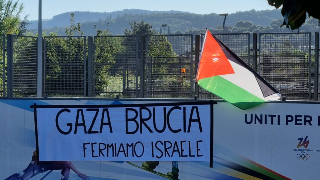 Ora che anche l’ONU parla apertamente di genocidio tacere è impossibile. Per questo ancora una volta è apparsa la bandiera palestinese. Per questo è apparso uno striscione che ci ricorda che mentre le nostre vite continuano quelle di molti palestinesi no.