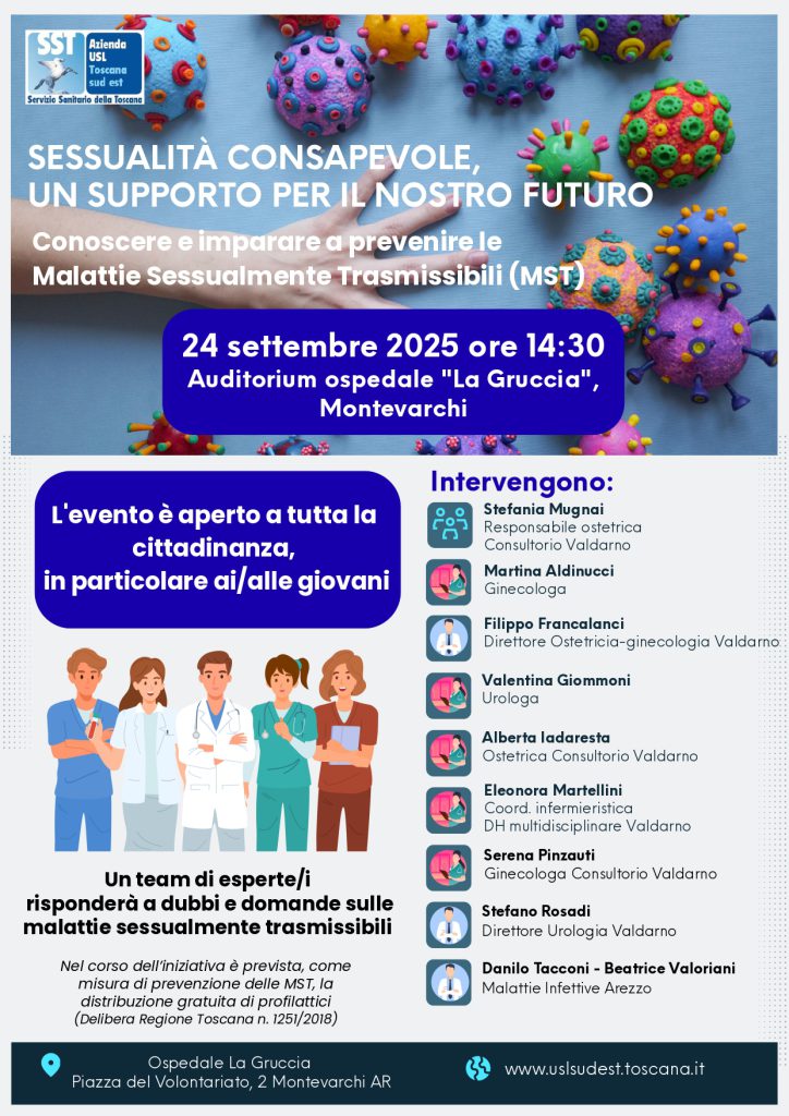 Dedicato in particolare ai giovani, ma aperto a tutta la cittadinanza, l’incontro sarà animato da un ricco pool di esperti dell’ASL Toscana sud est che saranno a disposizione del pubblico per aiutare a conoscere e imparare a prevenire le malattie sessualmente trasmissibili e ad acquisire comportamenti corretti e consapevoli in tema di sessualità. Durante tutta la sessione, sarà possibile porre domande in forma anonima, misurare la propria conoscenza sui temi tramite sondaggi web e interagire tra pari e con gli esperti, in modo da costruire insieme un percorso di conoscenza e approfondimento su temi così vicini alla vita di tutte e tutti, ma che a volte – soprattutto nei giovani – possono non essere conosciuti così bene, e quindi possono mettere a rischio la salute propria ed altrui. “L’obiettivo di questo incontro – dice la Responsabile ostetrica del Consultori Valdarno Stefania Mugnai – è dare ai giovani – e più in generale a tutta la popolazione del territorio – un’occasione di incontro in cui parlare liberamente, con esperti di varie discipline, della sessualità a trecentosessanta gradi, in modo da sfatare miti, false credenze, e promuovere comportamenti corretti capaci di tutelare la salute di tutti. Il bisogno di sviluppare una conoscenza più approfondita intorno al tema del sesso e dei rapporti sessuali è sempre più attuale e pressante: l’età media del primo rapporto sessuale si abbassa mentre aumenta la numerosità dei partner ed entrambi questi fattori possono – se non accompagnati da un’adeguata consapevolezza e conoscenza – aiutare la propagazione di malattie che da tempo non erano così diffuse.” “Secondo i dati AOGOI, – continua Serena Pinzauti, ginecologa del consultorio Valdarno – nel 2023 si sono registrati aumenti significativi in tutte le principali infezioni sessualmente trasmesse, tra cui gonorrea e clamidia ma anche sifilide primaria-secondaria (report ISS). Tra le persone più a rischio ci sono i giovani, gli uomini che hanno rapporti sessuali con uomini e le persone con più partner sessuali. In un quadro di questo genere, le campagne di prevenzione, insieme alla diagnosi precoce e l’accesso al test diventano fondamentali.” Infatti, come sottolinea il Dottor Filippo Francalanci, Direttore UOC Ginecologia e ostetricia dell’ospedale del Valdarno: “Negli ultimi anni si è notata una significativa riduzione del tema prevenzione per malattie trasmesse sessualmente come AIDS e sifilide. Sebbene oggi siano aumentate le possibilità terapeutiche, va rilanciato con forza il concetto che è la prevenzione la vera arma per sconfiggere queste patologie e ridurne il più possibile l’impatto sui giovani”. “C’è di buono – commenta Alberta Iadaresta, ostetrica del consultorio Valdarno – che è aumentata anche la richiesta di informazioni da fonti affidabili: anche nella nostra zona distretto abbiamo rilevato un aumento della domanda di indicazioni sulla trasmissione delle infezioni sessualmente trasmissibili, dell’accesso ai test diagnostici e ai presidi per la prevenzione e cura. Tutto questo ci ha portato a tante iniziative, tra cui questo appuntamento particolarmente importante, perché capace di affrontare il tema da tanti punti di vista diversi e complementari.” “La giornata – conclude il Dottor Rosadi, Direttore UOSD Urologia, ospedale del Valdarno – è di fondamentale importanza per conoscere quando, dove e perché eseguire esami e/o vaccinazioni, test e quando e in quali situazioni è necessario consultare il medico.” All’incontro parteciperanno la Dottoressa Elena Rebora, Direttrice Zona-Distretto Valdarno; la Dottoressa Stefania Mugnai, Responsabile Consultorio Valdarno; la Dottoressa Martina Aldinucci, Ginecologa; il Dottor Filippo Francalanci, Direttore UOC Ostetricia e ginecologia PO Valdarno; la Dottoressa Valentina Giommoni, urologa; la Dottoressa Alberta Iadaresta, ostetrica del Consultorio Valdarno; la Dottoressa Eleonora Martellini, coordinatrice infermieristica DH multidisciplinare Valdarno; la Dottoressa Serena Pinzauti, ginecologa del Consultorio Valdarno; il Dottor Stefano Rosadi, Direttore UOSD Urologia PO Valdarno; il Dottor Danilo Tacconi, Direttore UOC Malattie infettive ASL sud est e la Dottoressa Beatrice Valoriani della medesima UOC.
