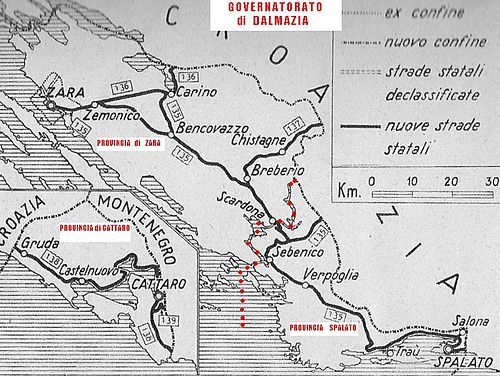 La cantoniera nell’immagine è sulla ex-SS 137 “della Valle Cherca”, in comune di Chistagne nella provincia di Zara ampliata con le conquiste territoriali del 1941. Allego una carta con i territori del Governatorato di Dalmazia, annesso dal 1941 al 1943, in cui sono disegnate le statali che attraversavano i nostri territori dell’epoca.