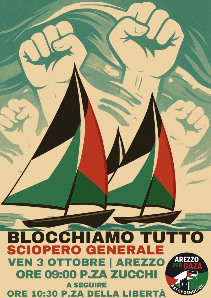 Scendiamo nelle strade e nelle piazze a sostegno della Global Sumud Flotilla che ha subito un vero e proprio atto di pirateria da parte del governo e dell’esercito Israeliano.Arezzo Per Gaza sostiene e sarà presente a tutte le iniziative e manifestazioni previste per domani ricordando l’importanza della manifestazione nazionale di sabato 4 ottobre a Roma per il quale abbiamo organizzato tre pullman.