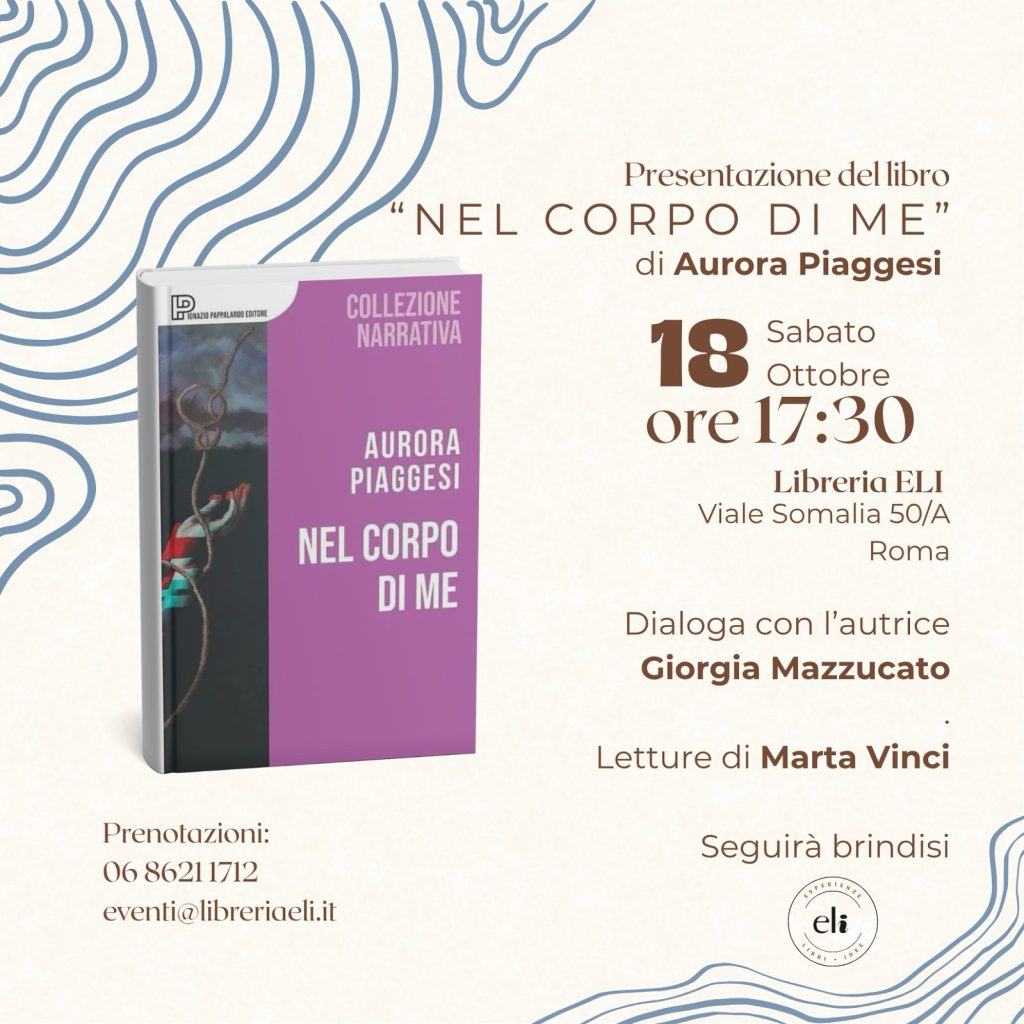Sabato 18 ottobre alle ore 18,30 la libreria ELI in viale Somalia 50 a Roma, ospiterà la presentazione del libro NEL CORPO DI ME di Aurora Piaggesi. Un racconto che unisce realismo e visione, corpo e metafora, per interrogarsi su cosa significhi davvero “dare la vita” e su quanto siamo disposti a comprendere ciò che sfugge alla logica