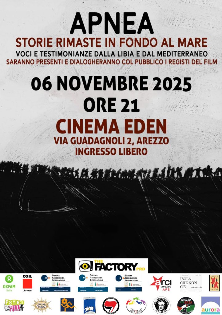 Arci e Associazione Tahomà gestori dei centri SAI dei Comuni di Bibbiena, Castiglion Fibocchi e dell’Unione dei Comuni del Casentino in collaborazione con tante realtà del territorio Arezzo, 4 novembre 2025 – Sarà una serata per riflettere su quanto continua ad accadere ogni giorno nel Mediterraneo e scoprire le storie di chi è stato costretto a rischiare la vita in mare, per raggiungere l’Italia e l’Europa, in fuga da guerre, persecuzioni e fame. Per comprendere l’importanza, oggi più che mai, di difendere e tutelare i diritti umani fondamentali di donne, bambini e uomini, a cui spesso vengono negati.L’appuntamento, ad ingresso libero, è per giovedì 6 novembre alle ore 21 al Cinema Eden di Arezzo (in via Guadagnoli,2), con la proiezione di “Apnea”: pellicola pluri-premiata firmata dai registi Stefano Poggioni, Elena Poggioni e Claudia Cataldi, che sarà presente alla serata.Un racconto struggente e assieme pieno di speranza, attraverso i percorsi di vita e le esperienze di un viaggio difficilissimo, che 14 ragazze e ragazzi (alcuni accolti nei SAI toscani) hanno deciso di raccontare per offrire una testimonianza autentica, personale e collettiva di tutti i rischi che devono affrontare coloro che decidono di intraprendere una vera e propria odissea verso il nostro Paese.L’iniziativa è promossa da Oxfam Italia, Arci e Associazione Tahomà – gestori dei centri SAI dei Comuni di Bibbiena, Castiglion Fibocchi e dell’Unione dei Comuni del Casentino – in collaborazione con: The Factory prd, Circolo Eureko, Casentino Antifascista, Liberamente, CGIL Arezzo, Associazione Donne insieme, Associazione Pepe Mujica, Officine della Cultura, Circolo Aurora, L’isola che non c’è, Psycho Hill fest, Arezzo per Gaza.“Dall’inizio dell’anno oltre 1.200 persone sono morte lungo la rotta del Mediterraneo centrale, dove dal 2014 hanno perso la vita quasi 33 mila migranti. – sottolineano le organizzazioni promotrici – Nonostante questo l’Italia continua a screditare le organizzazioni che si occupano di accoglienza e salvataggi in mare e ad applicare una politica di respingimenti che solo dall’inizio dell’anno ha riportato oltre 20 mila persone verso i lager libici, dove sono esposti ad abusi e torture indicibili, in virtù dell’accordo tra l’Italia e il Paese nord-africano siglato nel 2017, che proprio in questi giorni nel silenzio generale è stato rinnovato per altri tre anni. Per questo abbiamo ritenuto importante offrire al pubblico aretino l’occasione di riflettere sull’attualità del fenomeno migratorio senza filtri, da una prospettiva che troppo spesso avvertiamo come lontana da noi”.