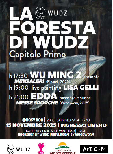 Alle 21:00 Edda racconta e suona “Messe sporche” (Woodworm, 2025). Una performance intima e tagliente dell’ex Ritmo Tribale, tra parola e canzone, che riporta al centro una scrittura cruda, visionaria e profondamente personale. L’opera si presenta come un universo attraversato da ironia spiazzante, testi surreali e libertà assoluta d’interpretazione, un anarchico flusso di coscienza privo di qualsiasi vincolo di politically correct. La scelta di Arezzo e della galleria Rosy Boa non è casuale: Wudz nasce in dialogo con il territorio, coltivando un ecosistema culturale a cui vuole offrire suggestioni e confronti. “La Foresta di Wudz” è un progetto di connessione urbana e collettiva, l’inizio di un nuovo percorso di attività e progettualità del gruppo Woodworm sul proprio territorio. Presente anche un’area food & beverage , dove la proposta sarà curata dalla Bottega di Montemercole e Art Café, che dalle 18:00 saranno attivi con cocktail e area food, mentre il wine bar per questo primo appuntamento ospiterà i vini dall’Azienda Matrignano.