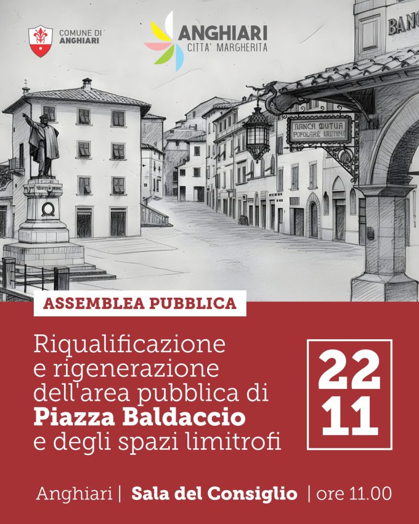 L’Amministrazione Comunale di Anghiari invita la cittadinanza a partecipare all’incontro pubblico in programma sabato 22 novembre alle ore 11:00 nella Sala del Consiglio Comunale di Palazzo Pretorio, in Piazza del Popolo. L’appuntamento sarà dedicato alla presentazione del progetto di riqualificazione e rigenerazione dell’area pubblica di Piazza Baldaccio e degli spazi limitrofi, un intervento strategico per valorizzare uno dei luoghi più rappresentativi e vissuti del paese
