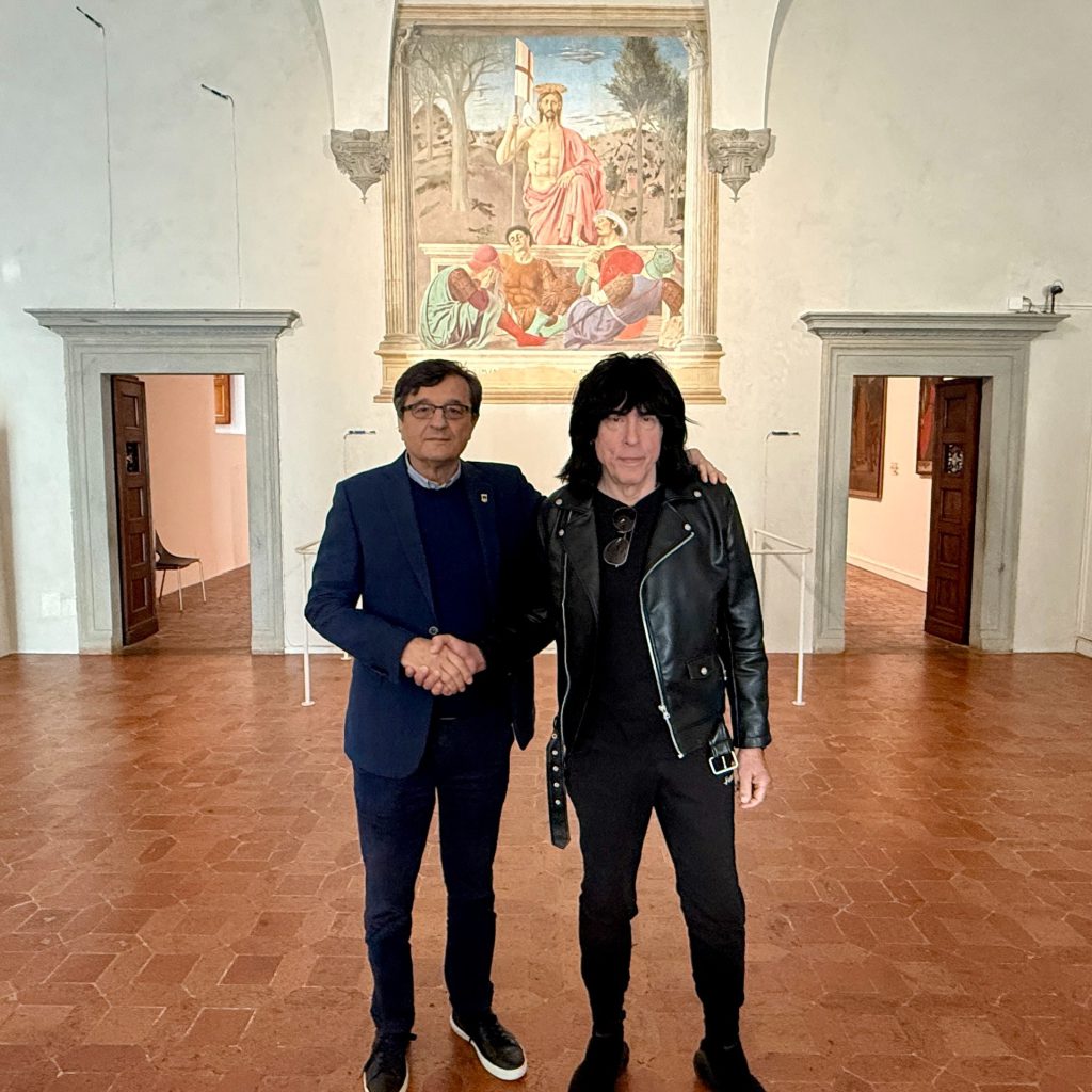 Partito da Castiglion Fiorentino e dopo aver visitato la Madonna del Parto di Monterchi e la Madonna di Donatello a Citerna, l’artista è arrivato nella tarda mattinata di ieri al Museo Civico di Sansepolcro, luogo simbolo del Rinascimento italiano. Qui, accompagnato dallo staff museale, Marky Ramone ha potuto ammirare da vicino alcuni dei massimi capolavori di Piero della Francesca, tra cui la celeberrima “Resurrezione” e il “Polittico della Misericordia”, oltre alle tante preziose opere esposte nelle sale del museo. Un incontro straordinario tra la cultura rock internazionale e il patrimonio artistico più identitario della città. “Marky è un grande musicista e la musica è un linguaggio universale che unisce i popoli. Credo che queste opere millenarie, anche se lontane dal suo genere, possano ispirarlo profondamente – ha dichiarato il sindaco di Sansepolcro, Fabrizio Innocenti, che ha accolto con entusiasmo questa visita d’eccezione. – Sansepolcro continua a essere un punto di riferimento imprescindibile per chi desidera incontrare il genio di Piero della Francesca e la bellezza senza tempo del Rinascimento.” L’itinerario culturale visitato dal musicista, grazie anche alla vincente collaborazione fra i sindaci Mario Agnelli, Alfredo Romanelli ed Enea Paladino, rientra nel progetto “Rinascimento in Valtiberina e Valdichiana”, avviato nel 2024 e dedicato alla valorizzazione congiunta di un patrimonio unico: opere di Piero della Francesca, Bartolomeo della Gatta, Donatello, Raffaellino del Colle e altri maestri, custodite in un raggio di appena 40 km. Un percorso che unisce arte, paesaggi straordinari e un’eccellenza enogastronomica riconosciuta a livello internazionale. Sansepolcro, con il suo Museo Civico e le opere di Piero della Francesca, rappresenta uno dei cardini del progetto: una “mostra permanente e diffusa” che racconta, attraverso secoli di storia, la vocazione del territorio alla creazione e alla conservazione della bellezza.