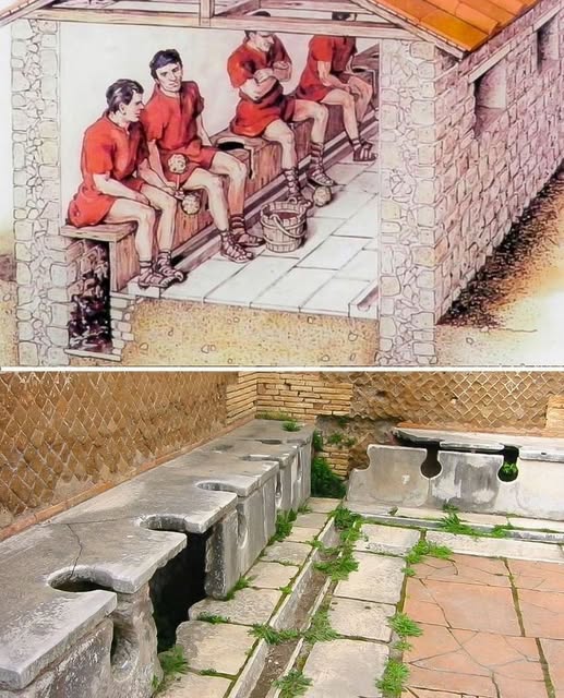 Le latrine pubbliche romane, chiamate foricae o vespasiani, erano ambienti sociali e igienici avanzati, caratterizzati da lunghe panche in marmo o pietra con sedili forati, sopra un canale d’acqua corrente che fungeva da scarico continuo, collegato alle fogne. Erano luoghi di incontro e affari, spesso decorati, dove i Romani socializzavano gomito a gomito, usando spugne su bastoncini (tersorium) per l’igiene personale, puliti poi nell’acqua.