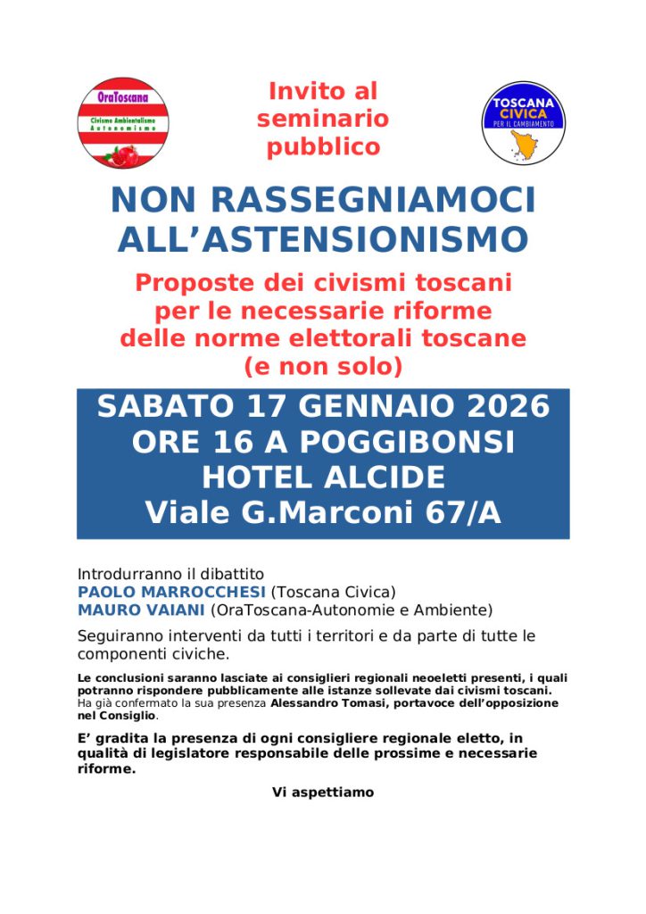 Proposte dei civismi toscani per le necessarie riforme delle norme elettorali toscane (e non solo) ntrodurranno il dibattito PAOLO MARROCCHESI (Toscana Civica) MAURO VAIANI (OraToscana-Autonomie e Ambiente)Seguiranno interventi da tutti i territori e da parte di tutte le componenti civiche.