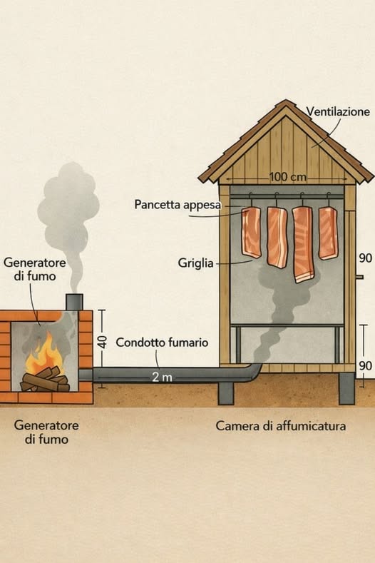 L’immagine mostra un metodo tradizionale di affumicatura, semplice e naturale Il fuoco è separato dalla carne, così il fumo sale lentamente e avvolge gli alimenti senza cuocerli troppo. Questo sistema permette di conservare il cibo più a lungo e di dargli un sapore profondo e autentico L’affumicatura richiede tempo, pazienza e attenzione. Il legno giusto, una buona ventilazione e una temperatura controllata fanno la differenza. È un sapere antico, tramandato da generazioni, che unisce natura e cucina Il fumo passa attraverso un condotto lungo La carne è appesa per una diffusione uniforme Il calore resta basso e costante Il legno naturale profuma gli alimenti Il risultato è un gusto intenso e naturale Il metodo aiuta anche la conservazione Ogni dettaglio ha la sua importanza Una tecnica semplice, ma ricca di tradizione e sapore