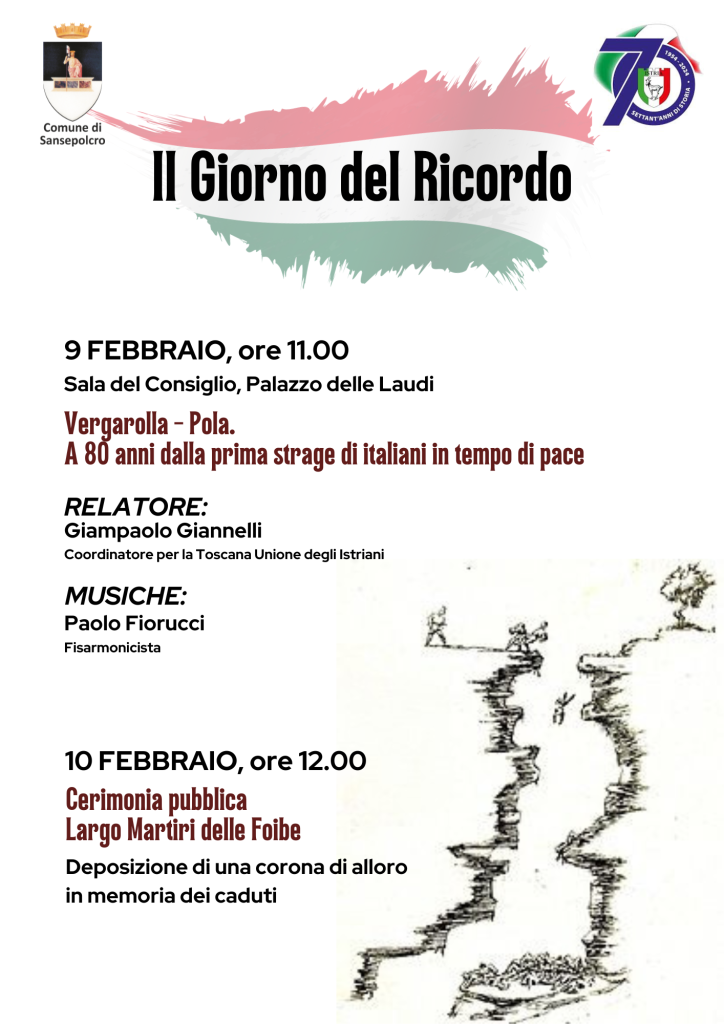 Il primo appuntamento è in programma lunedì 9 febbraio alle ore 11.00, presso la Sala del Consiglio di Palazzo delle Laudi, con l’incontro dal titolo “Vergarolla – Pola. A 80 anni dalla prima strage di italiani in tempo di pace”. I saluti istituzionali saranno a cura del sindaco Fabrizio Innocenti, e dell’assessore alla cultura Francesca Mercati. La riflessione storica sarà affidata a Giampaolo Giannelli, coordinatore per la Toscana dell’Unione degli Istriani, che ripercorrerà i tragici fatti di Vergarolla e il contesto storico in cui maturarono. L’incontro sarà accompagnato da un momento musicale a cura del fisarmonicista Paolo Fiorucci, a sottolineare con il linguaggio dell’arte l’intensità del ricordo e prenderà parte alla cerimonia anche Anna Maria Sereni, cittadina di Sansepolcro originaria proprio delle terre istriane dalle quali è dovuta scappare molti anni fa. Il secondo momento commemorativo si svolgerà martedì 10 febbraio alle ore 12.00 con una cerimonia pubblica presso Largo Martiri delle Foibe a Sansepolcro, dove verrà deposta una corona di alloro in memoria dei caduti, quale gesto simbolico di rispetto e vicinanza alle vittime e alle loro famiglie. Attraverso questi appuntamenti, l’Amministrazione comunale rinnova il proprio impegno nel custodire la memoria storica, promuovendo la conoscenza, il rispetto e la consapevolezza, affinché il ricordo diventi strumento di responsabilità civile e di pace per le generazioni presenti e future.