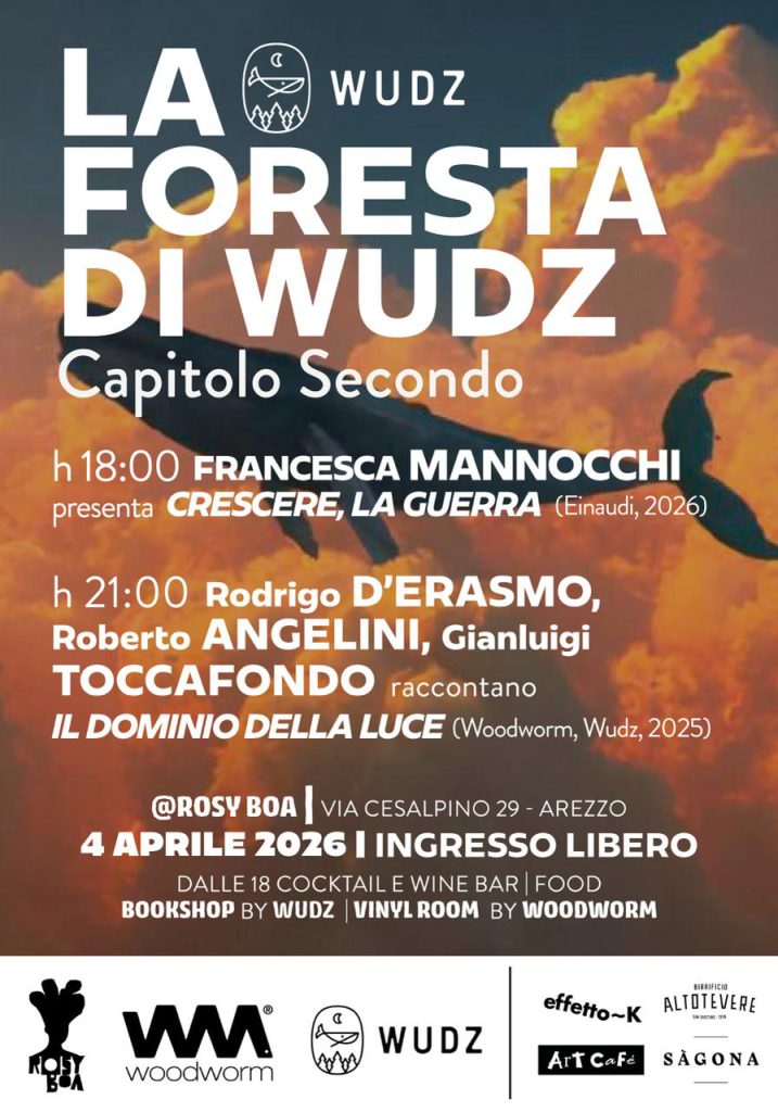 — Prosegue ad Arezzo il percorso de La Foresta di Wudz, il format culturale ideato da Wudz Edizioni, in collaborazione con Rosy Boa e Woodworm, che intreccia libri, arte e musica in un ecosistema di linguaggi e visioni contemporanee. Sabato 4 aprile 2026, negli spazi del Rosy Boa (via Cesalpino 29), protagonisti del secondo capitolo saranno Francesca Mannocchi, Rodrigo D’Erasmo e Roberto Angelini, in una nuova serata che mette al centro il dialogo tra narrazione, arti visive e suono. L’ingresso è libero. La serata sarà inoltre dedicata alla memoria di Gabriele Gatti, figura di riferimento per la vita culturale, politica e musicale del territorio, prematuramente scomparso nelle scorse settimane. Alle 18.00 la giornalista e scrittrice Francesca Mannocchi presenta “Crescere, la guerra” (Einaudi, 2026), un racconto che attraversa i conflitti contemporanei con uno sguardo intimo e politico, capace di interrogare il presente a partire dalle storie individuali e collettive.