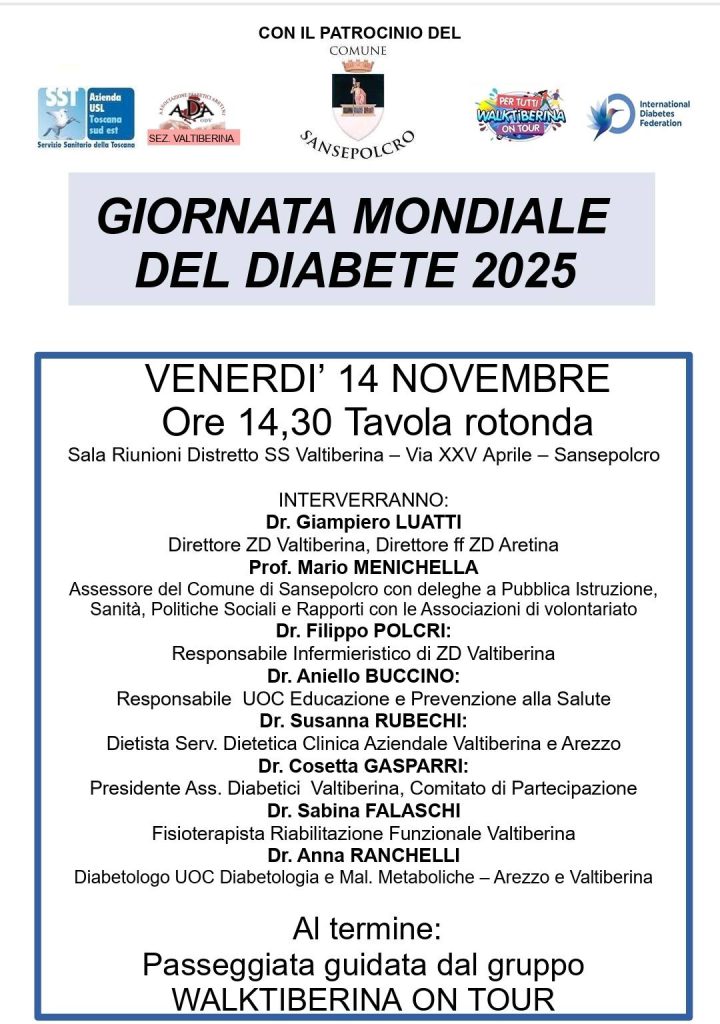 SANSEPOLCRO -L’appuntamento è fissato per venerdì 14 novembre alle ore 14:30 presso la Sala Riunioni del Distretto Socio Sanitario Valtiberina in Via XXV Aprile a Sansepolcro, dove si terrà la tavola rotonda “Prevenire il diabete: una responsabilità condivisa”, con la partecipazione di medici e specialisti impegnati nella cura e nella sensibilizzazione su questo tema. Tavola rotonda e camminata insieme per promuovere la salute e la consapevolezza. In occasione della Giornata Mondiale del Diabete, che ogni anno richiama l’attenzione sulla prevenzione e sulla gestione di una delle patologie croniche più diffuse al mondo, il Comune di Sansepolcro, insieme all’Azienda USL Toscana Sud Est, all’Associazione Diabetici Aretini – sezione Valtiberina e al gruppo WalkTiberina on Tour, promuove un pomeriggio di approfondimento, confronto e movimento.