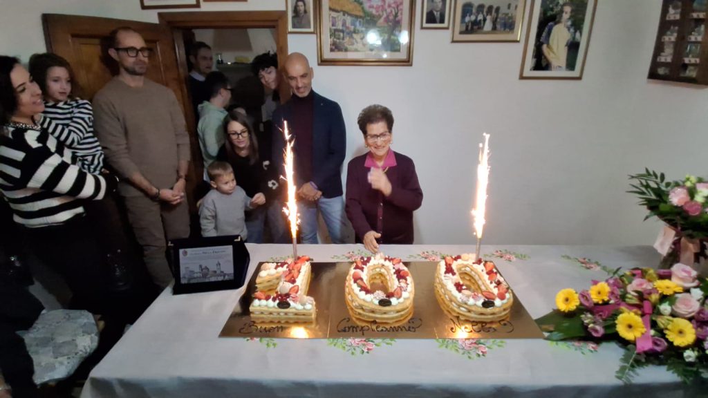 Ha spento 100 candeline sulla torta di compleanno, Nella Frontini, stretta nel caloroso abbraccio di 23 persone, fra figli, nipoti, bisnipoti e trisnipoti – Il sindaco Luca Secondi oggi gli ha consegnato una targa ufficiale