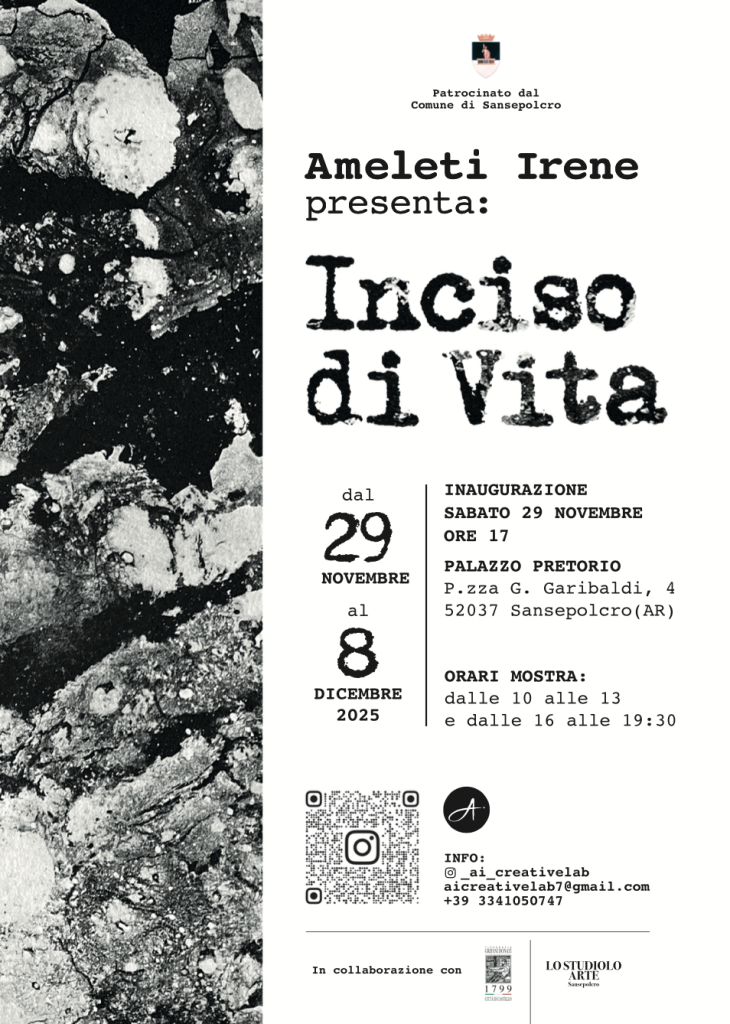 La nuova mostra di Irene Ameleti tra arte, sperimentazione e tradizione tipografica Il Comune di Sansepolcro è lieto di annunciare l’inaugurazione della mostra Inciso di Vita, progetto artistico ideato e curato da Irene Ameleti, che sarà visitabile dal 29 novembre all’8 dicembre 2025 presso Palazzo Pretorio, in piazza Garibaldi.